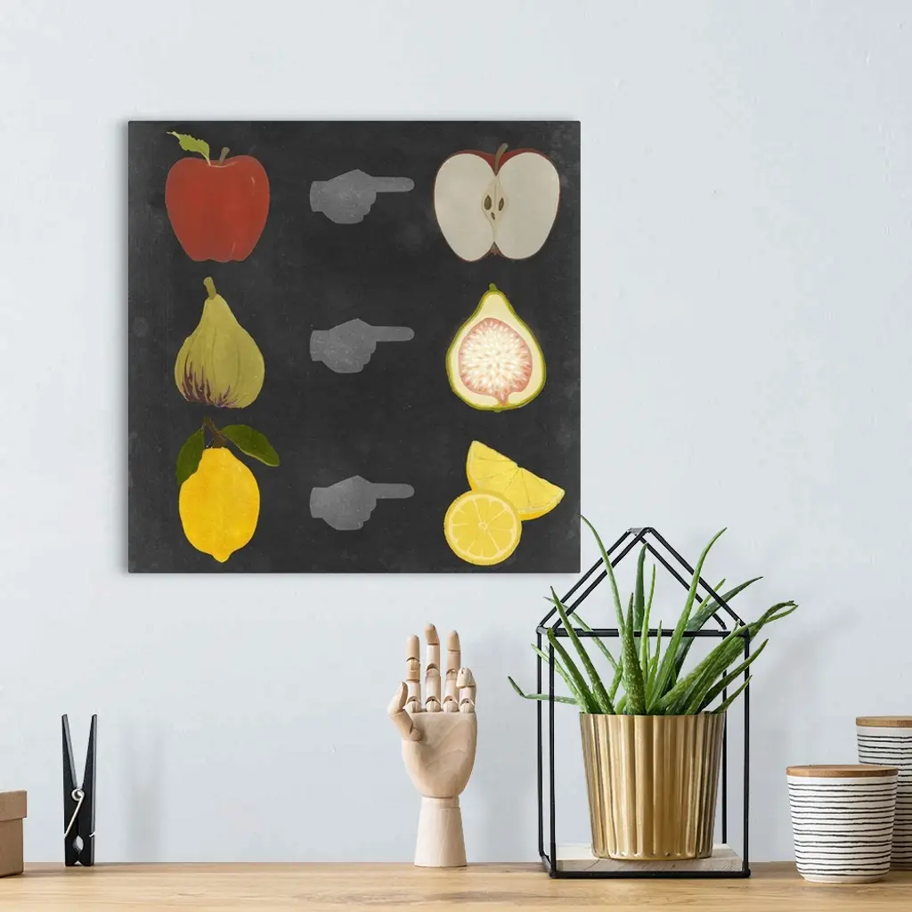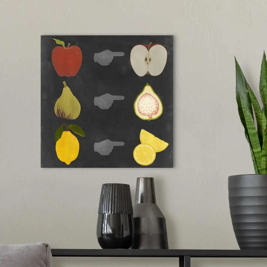 Contemporary artwork of fruits and their halves in chalkboard style.