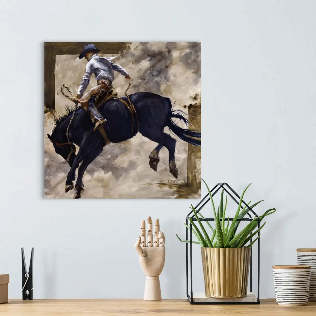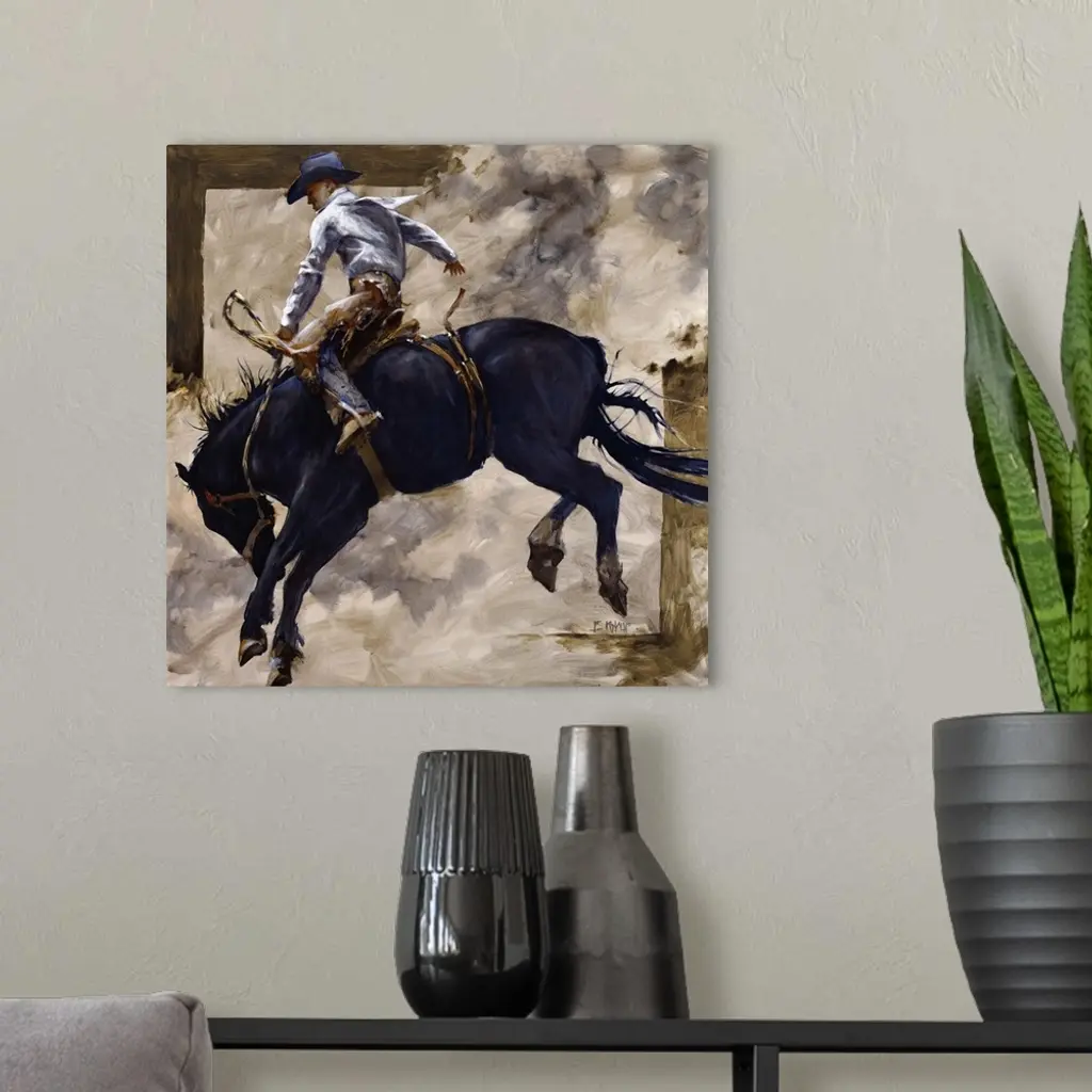 Contemporary western theme painting of a cowboy riding a bucking bronco.