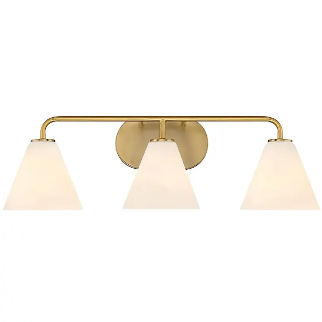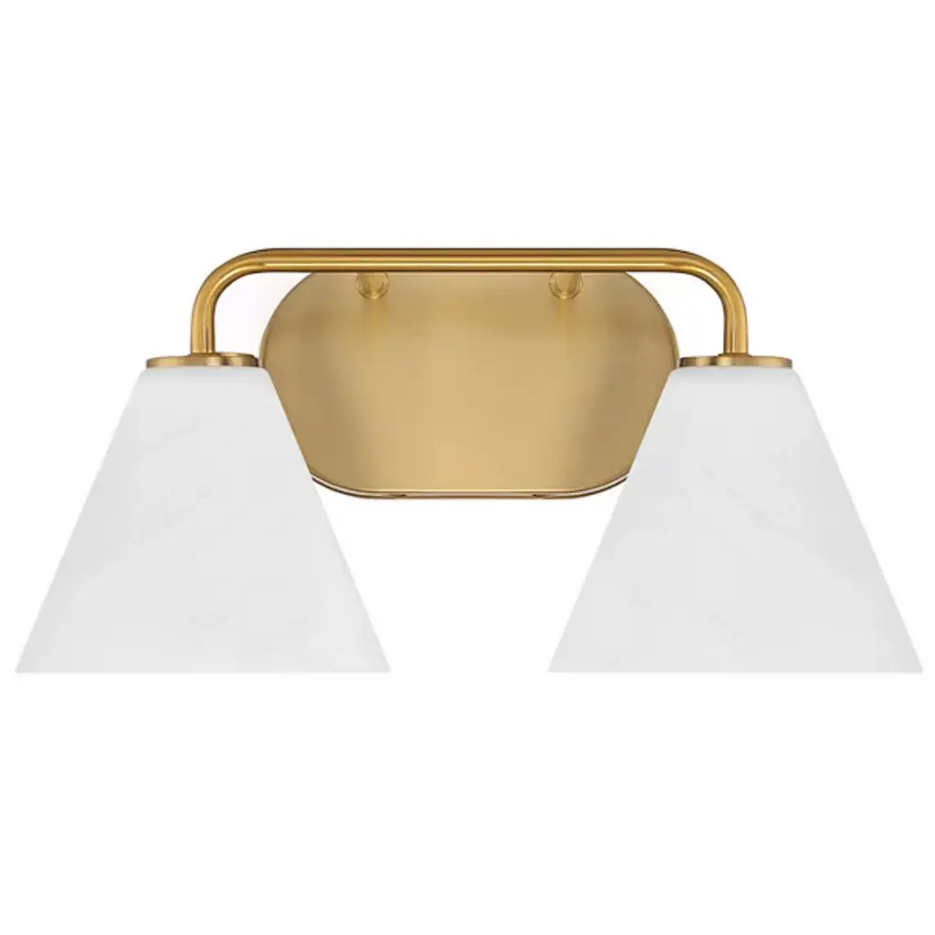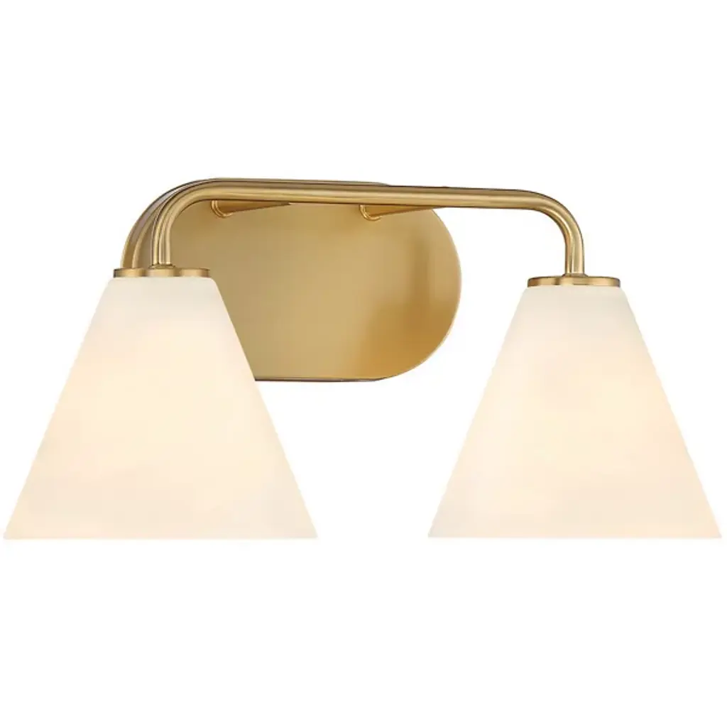 The Blair Bath Bar from Savoy House supplements a warm, welcoming glow to your bathroom or powder room. It has two conical shades of strie glass, their surfaces adorned with delicate wisps and swirls. Versatility is key with the Blair Bath Bar. Its transitional design with the option to install the fixture with the glass facing up or down provides flexibility, allowing you to customize the lighting effect to suit your space and preferences.