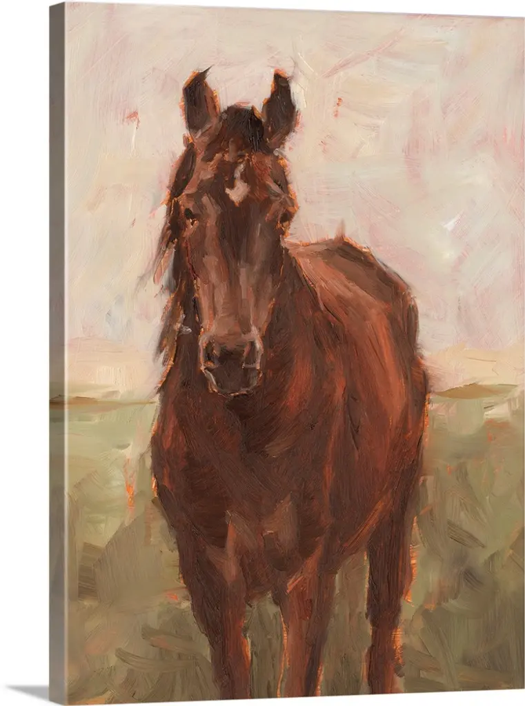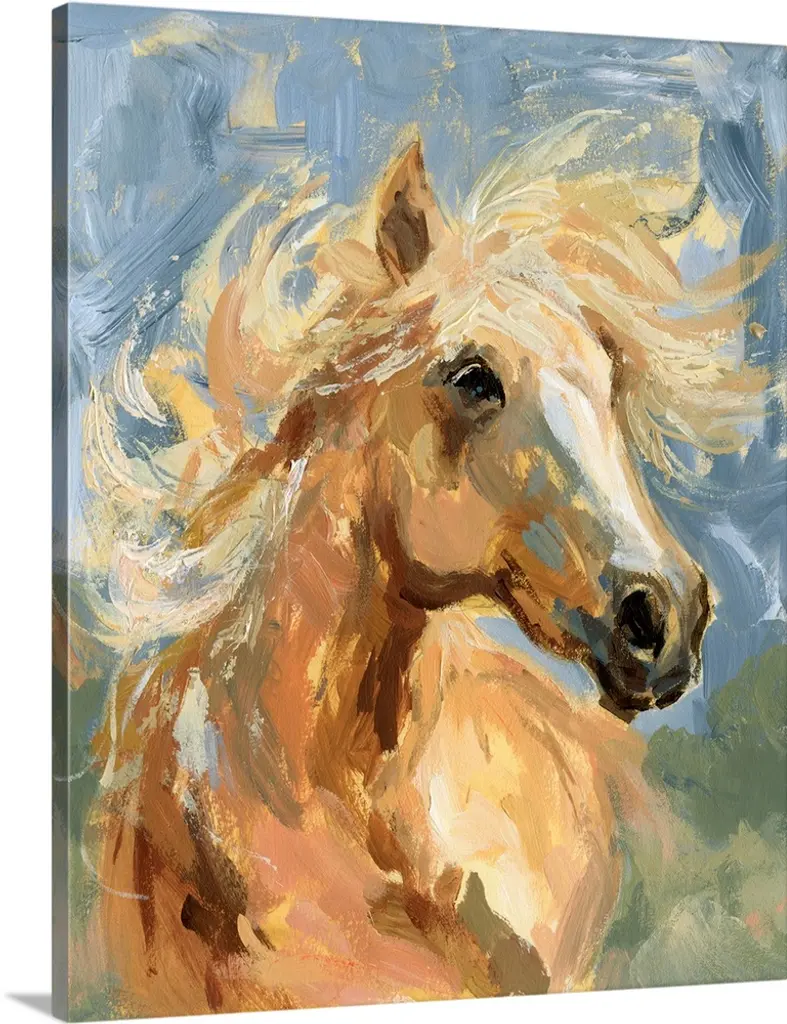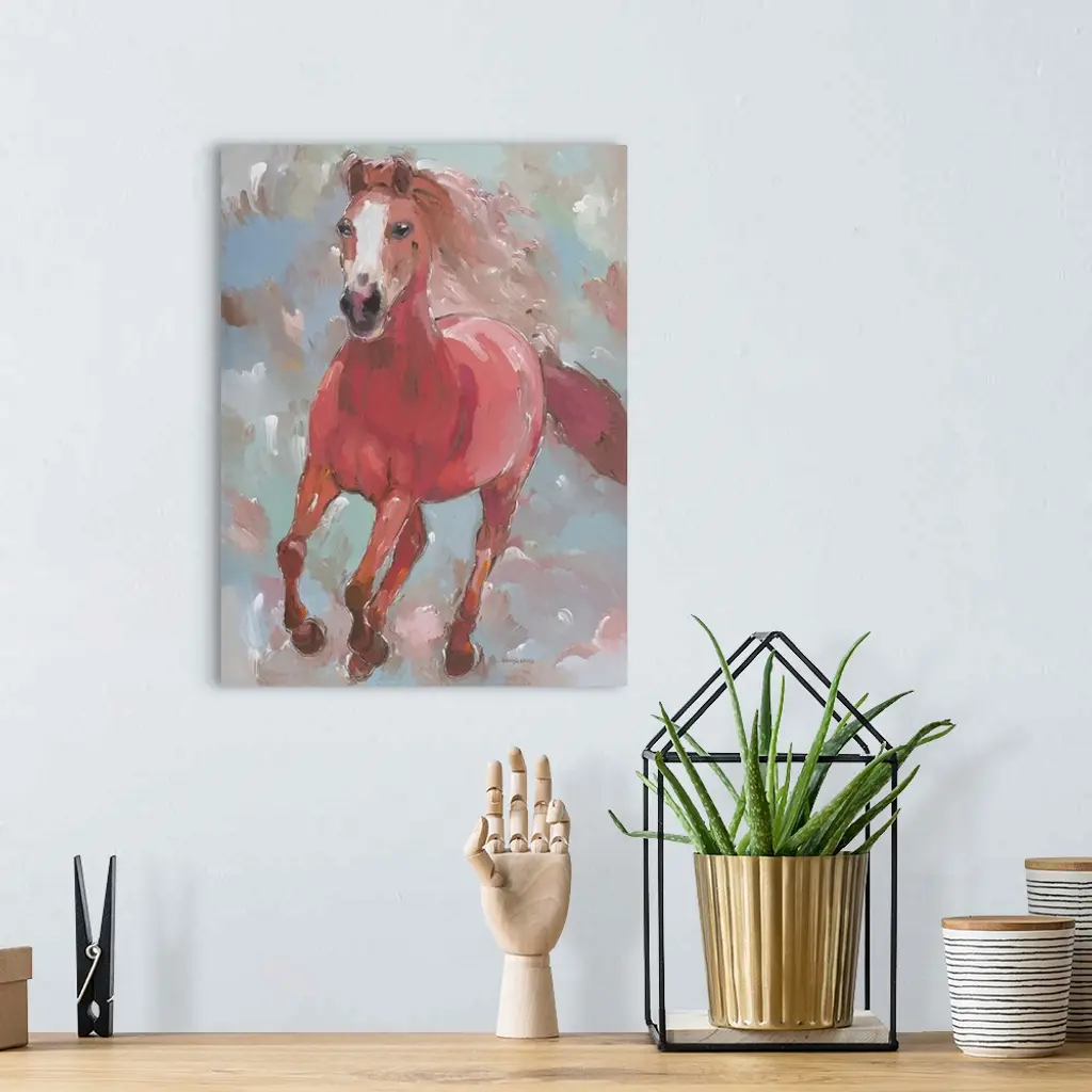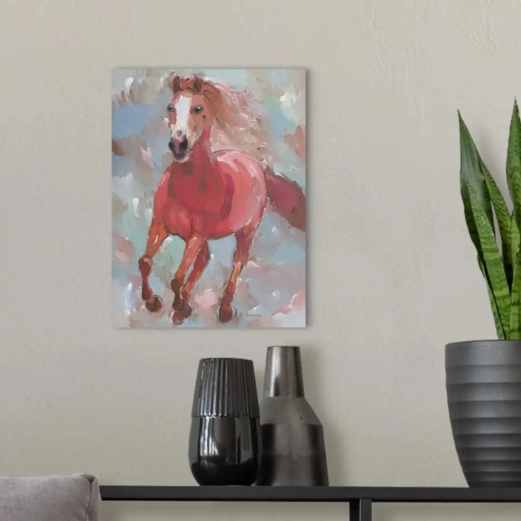 Contemporary painting of a galloping horse made with shades of pink on a colorful pastel background.