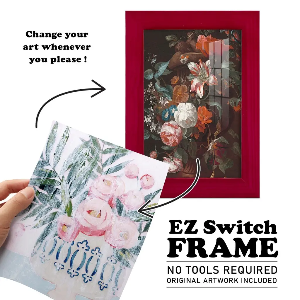 Bleached Bouquet II -EZ SWITCH Framed Print w/glass-Cherry Red A delightful, framed print. Featuring a solid wood frame with real wood glass. This premium print is giclee quality. In addition, every frame features a removable back and table top stand. This allows you to change your art in the future or to just stand the art on a table for a new look. We are sure you'll enjoy our new series of EZ SWITCH Framed Art. Solid Wood Frame Real Glass Removable / Replaceable Art Built in Tabletop Stand Sizes range from 4x6 up to 12x15 - buy just one or pair them up as sets as you see fit.