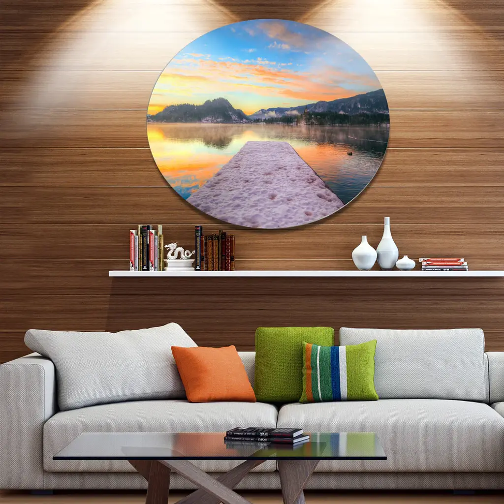 Bring Contemporary Abstraction to your home with this large Circle Metal wall art. This Bled With Lake in Winter Slovenia Metal Artwork makes it the focal point of any room or office. - White Gloss Coating ensures colors are extra vibrant with light reflection.- Aluminum grade Sheet Metal with 1 inch mounting frame on the back giving the illusion that the artwork is floating on the wall..- Mounting Brackets are included along with instructions.- High Quality Digital images are created directly into a glossy aluminum panel producing a stunning and captivating print into the glossy finish of the metal.- Water, Fire and Scratch resistant HD Aluminum panels.- Looks better than any photo paper and guaranteed to last at least 20 years- Easy to clean with a microfiber cloth. Colors are far superior to regular Canvas Art. - Easy to Hang