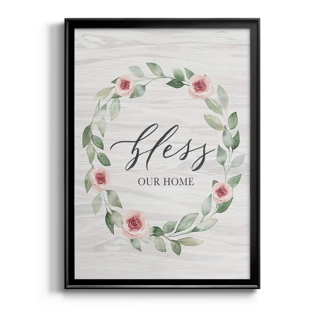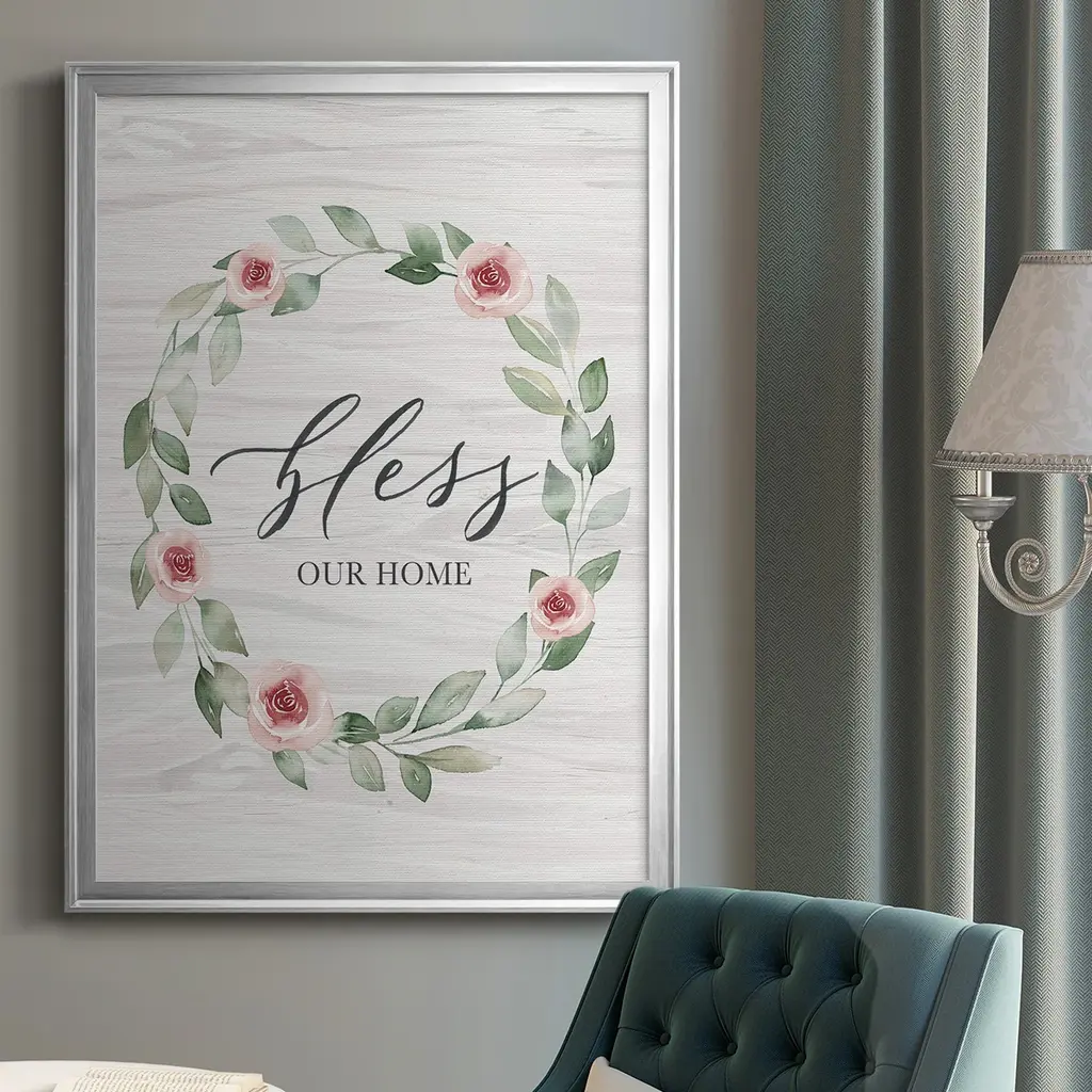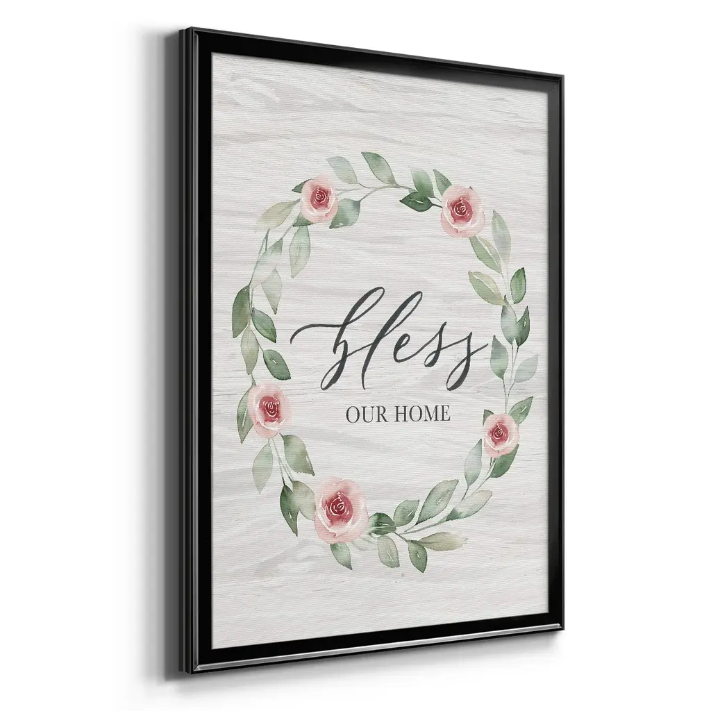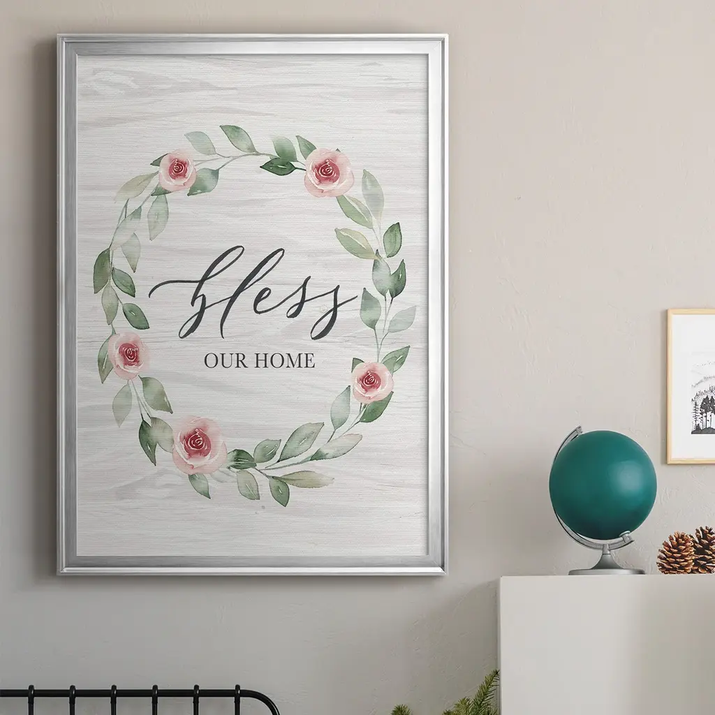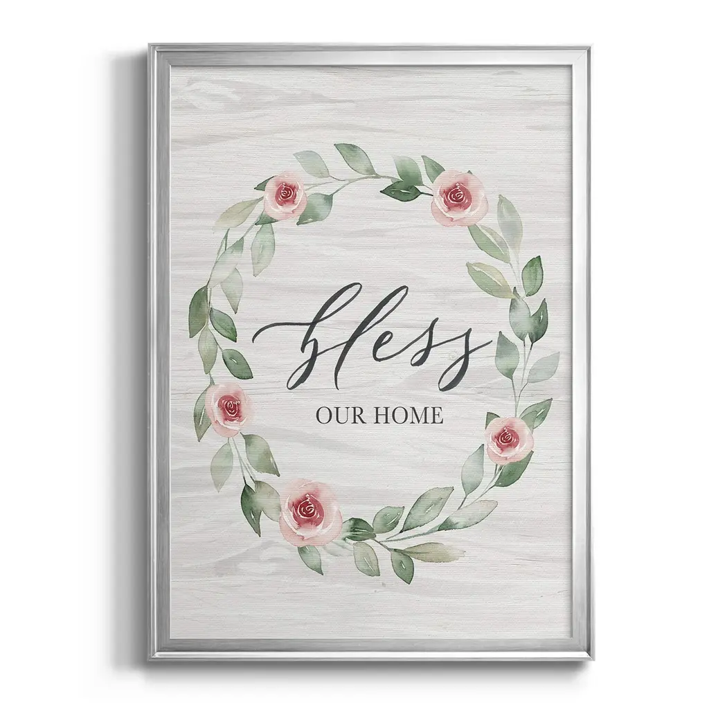 Bless Our Home Premium Framed Print - Ready to Hang A Premium Framed Print created to last. Framed in distressed wood and available in an array of sizes and colors Featuring a beveled a solid wood stretcher bar, each piece comes ready to hand 4 SIZES AVAILABLE 30.5''X42.5'' - Overall Size 26.5'X36.5'' - Overall Size 22.5''x30.5'' - Overall Size 18.5''x24.5'' - Overall Size Each piece is made to order. Each piece comes with hanging hardware. Made in the USA Ready to Hang