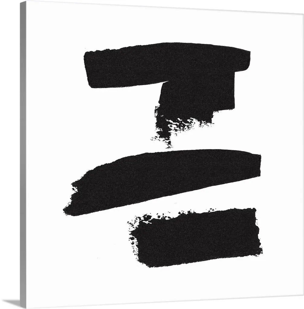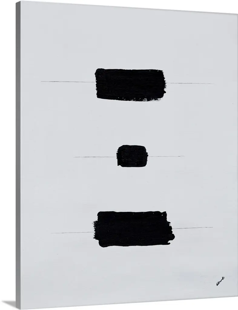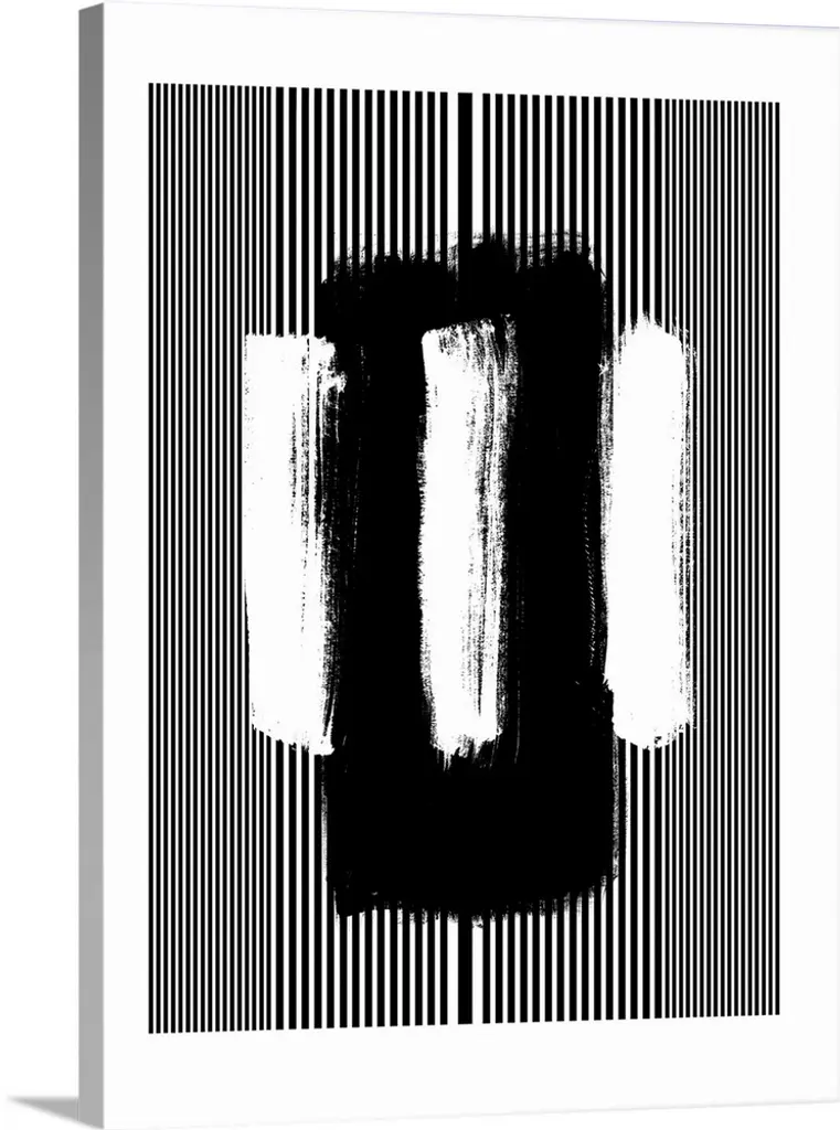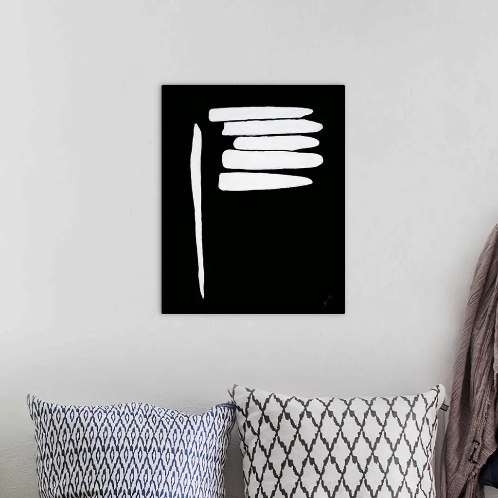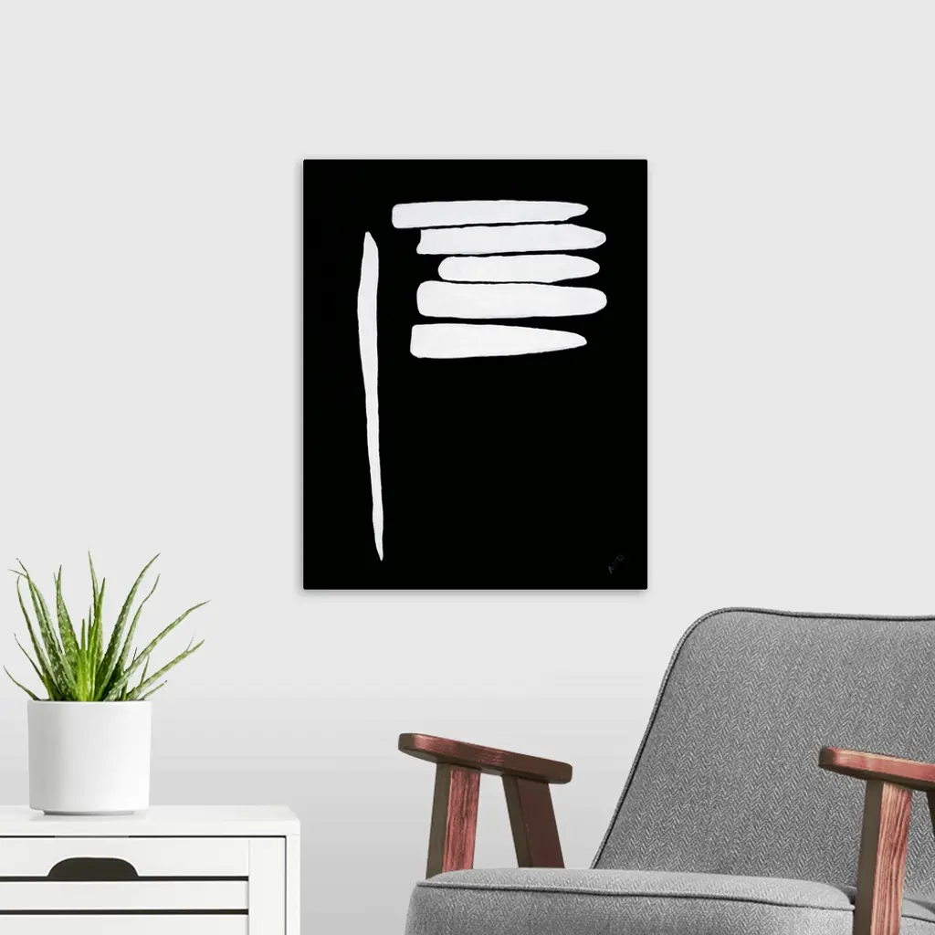 Contemporary abstract painting that has a solid black background and thick white lines- one running vertically and the other five stacked on top of each other horizontally.