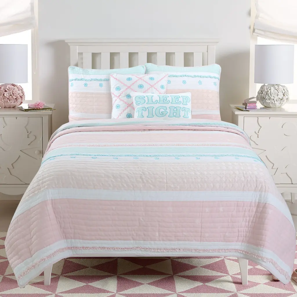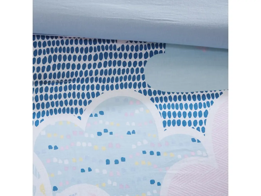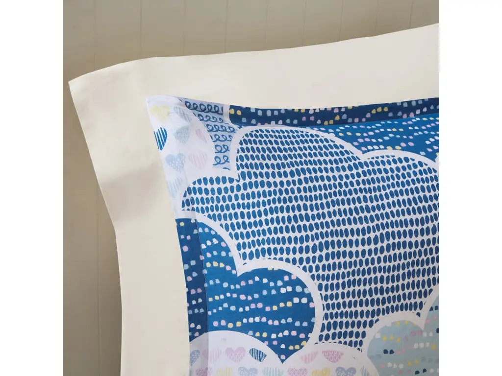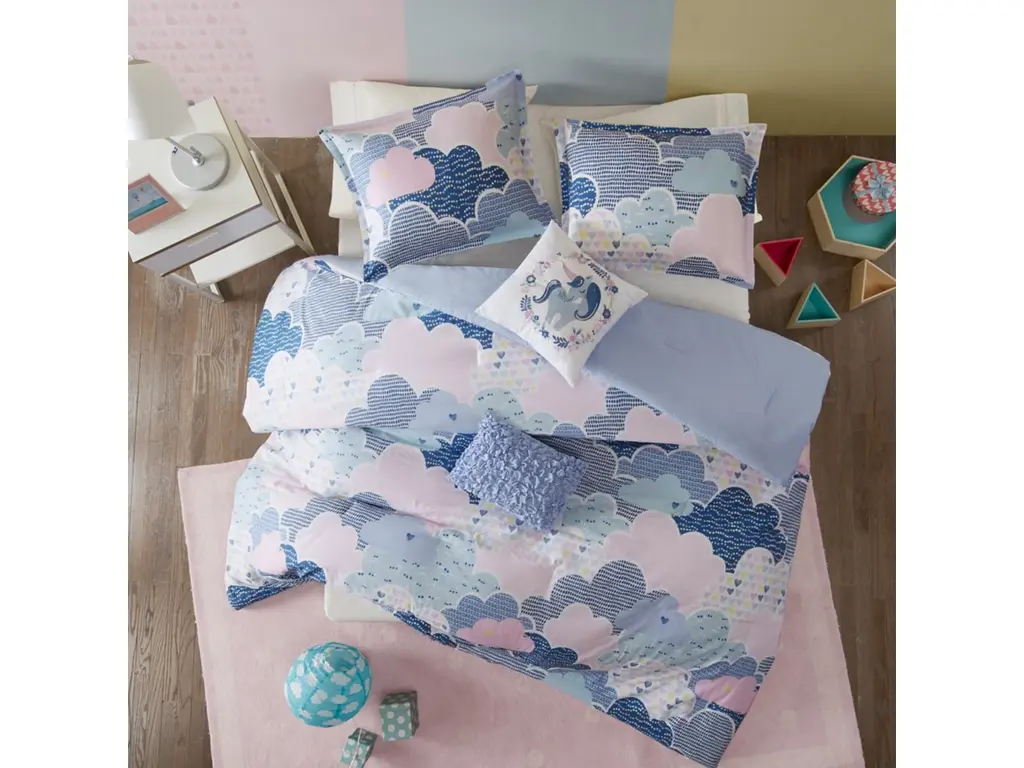 Drift off to dreamland with the whimsical charm of the Urban Habitat Kids Cloud Cotton Printed Comforter Set. The comforter and shams (1 for Twin Sizes) showcase a cute and fluffy cloud motif in a soft colorful palette with a solid reverse. An oblong decorative pillow features all-over ruching and the square pillow features an embroidered unicorn. Made from 100% pre-shrunk cotton, this comforter set is hypoallergenic and bed-ready right out of the package. This bedding set is also OEKO-TEX certified, meaning it does not contain any harmful substances or chemicals, and uses an antimicrobial treatment that provides built-in freshness protection, reducing the growth of odor causing bacteria to keep fabric lasting longer.
