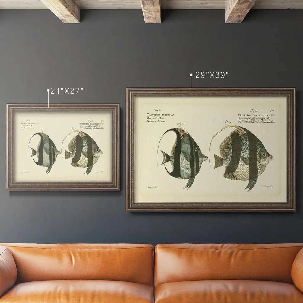 Bloch Antique Fish I Premium Framed Canvas- Ready to Hang A Premium Framed Canvas created to last. Framed in distressed wood and available in an array of sizes and colors Featuring a beveled a solid wood stretcher bar, each piece comes ready to hand 3 SIZES AVAILABLE 16''X20'' - Overall Size 18'X27'' - Overall Size 24''x36'' - Overall Size Each piece is made to order. Each piece comes with hanging hardware. Made in the USA Ready to Hang Giclee Paper Print Acrylic Glass Beveled Matt Board