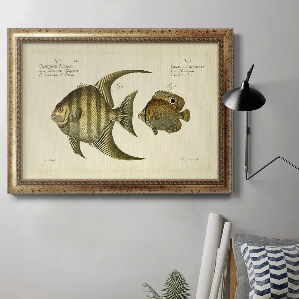 Bloch Antique Fish I Premium Framed Canvas- Ready to Hang A Premium Framed Canvas created to last. Framed in distressed wood and available in an array of sizes and colors Featuring a beveled a solid wood stretcher bar, each piece comes ready to hand 3 SIZES AVAILABLE 16''X20'' - Overall Size 18'X27'' - Overall Size 24''x36'' - Overall Size Each piece is made to order. Each piece comes with hanging hardware. Made in the USA Ready to Hang Giclee Paper Print Acrylic Glass Beveled Matt Board