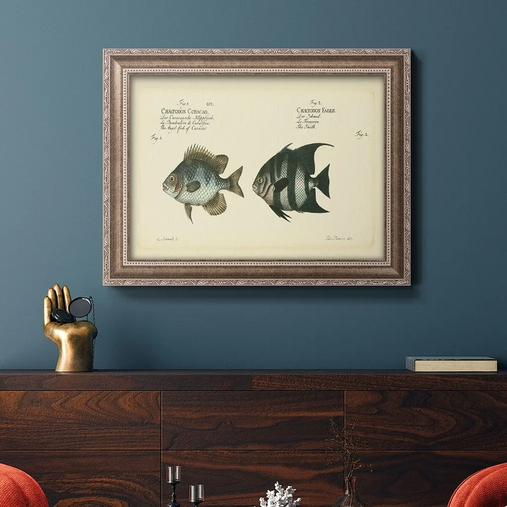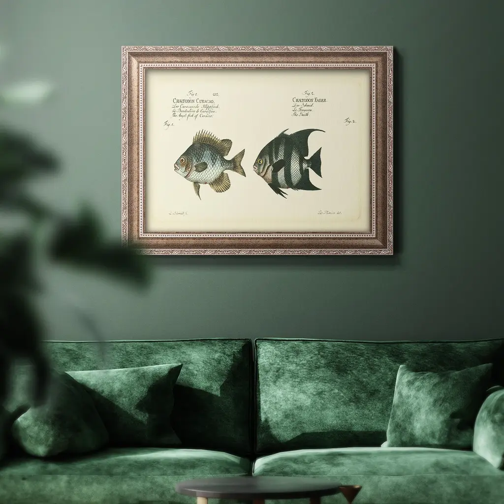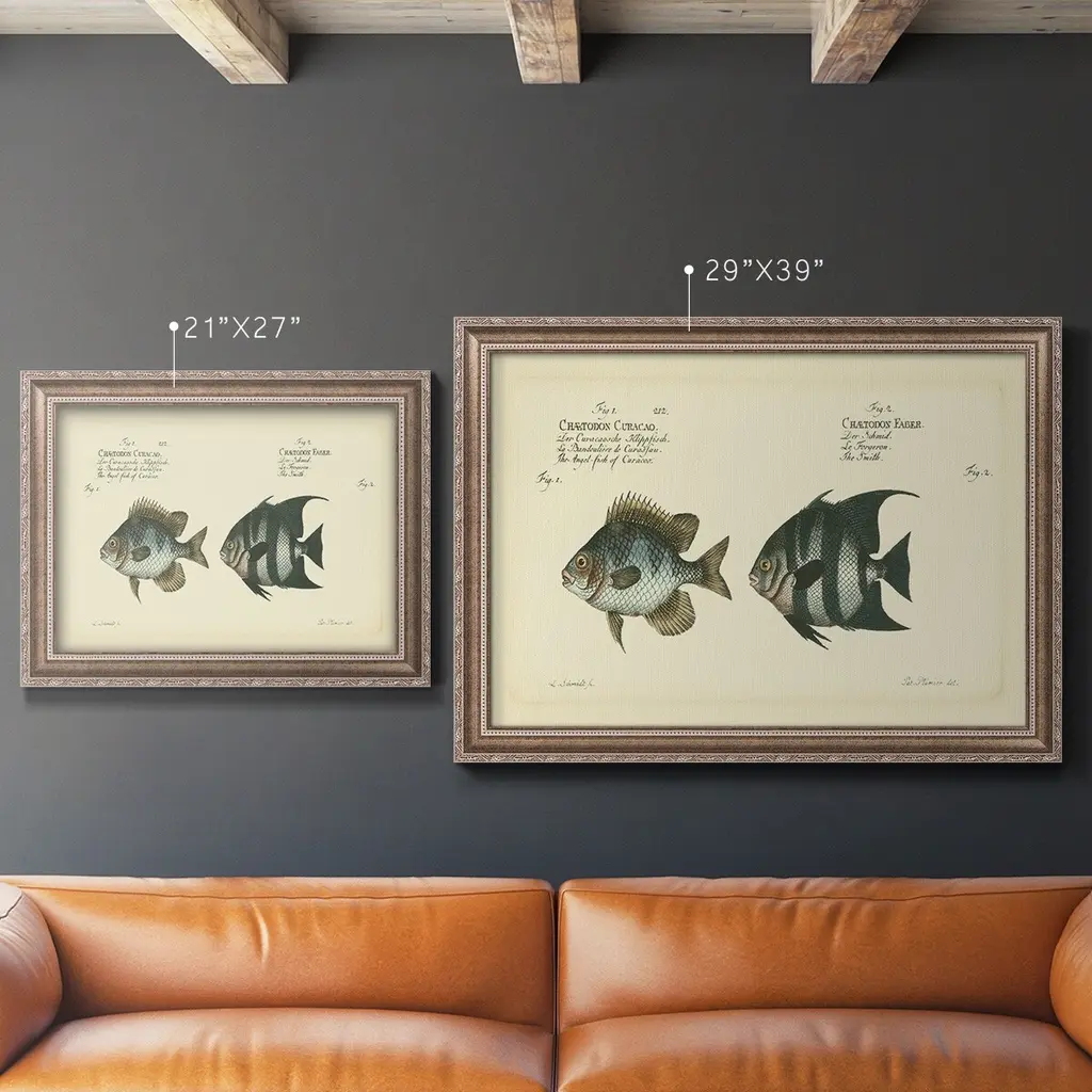 Bloch Antique Fish II Premium Framed Canvas- Ready to Hang A Premium Framed Canvas created to last. Framed in distressed wood and available in an array of sizes and colors Featuring a beveled a solid wood stretcher bar, each piece comes ready to hand 3 SIZES AVAILABLE 16''X20'' - Overall Size 18'X27'' - Overall Size 24''x36'' - Overall Size Each piece is made to order. Each piece comes with hanging hardware. Made in the USA Ready to Hang Giclee Paper Print Acrylic Glass Beveled Matt Board