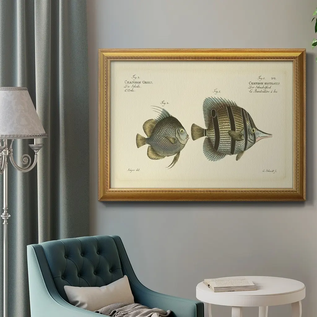 Bloch Antique Fish III Premium Framed Canvas- Ready to Hang A Premium Framed Canvas created to last. Framed in distressed wood and available in an array of sizes and colors Featuring a beveled a solid wood stretcher bar, each piece comes ready to hand 3 SIZES AVAILABLE 16''X20'' - Overall Size 18'X27'' - Overall Size 24''x36'' - Overall Size Each piece is made to order. Each piece comes with hanging hardware. Made in the USA Ready to Hang Giclee Paper Print Acrylic Glass Beveled Matt Board