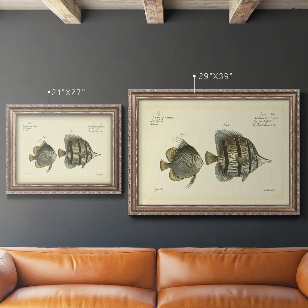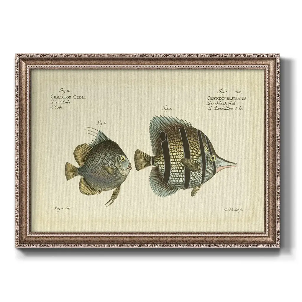 Bloch Antique Fish III Premium Framed Canvas- Ready to Hang A Premium Framed Canvas created to last. Framed in distressed wood and available in an array of sizes and colors Featuring a beveled a solid wood stretcher bar, each piece comes ready to hand 3 SIZES AVAILABLE 16''X20'' - Overall Size 18'X27'' - Overall Size 24''x36'' - Overall Size Each piece is made to order. Each piece comes with hanging hardware. Made in the USA Ready to Hang Giclee Paper Print Acrylic Glass Beveled Matt Board