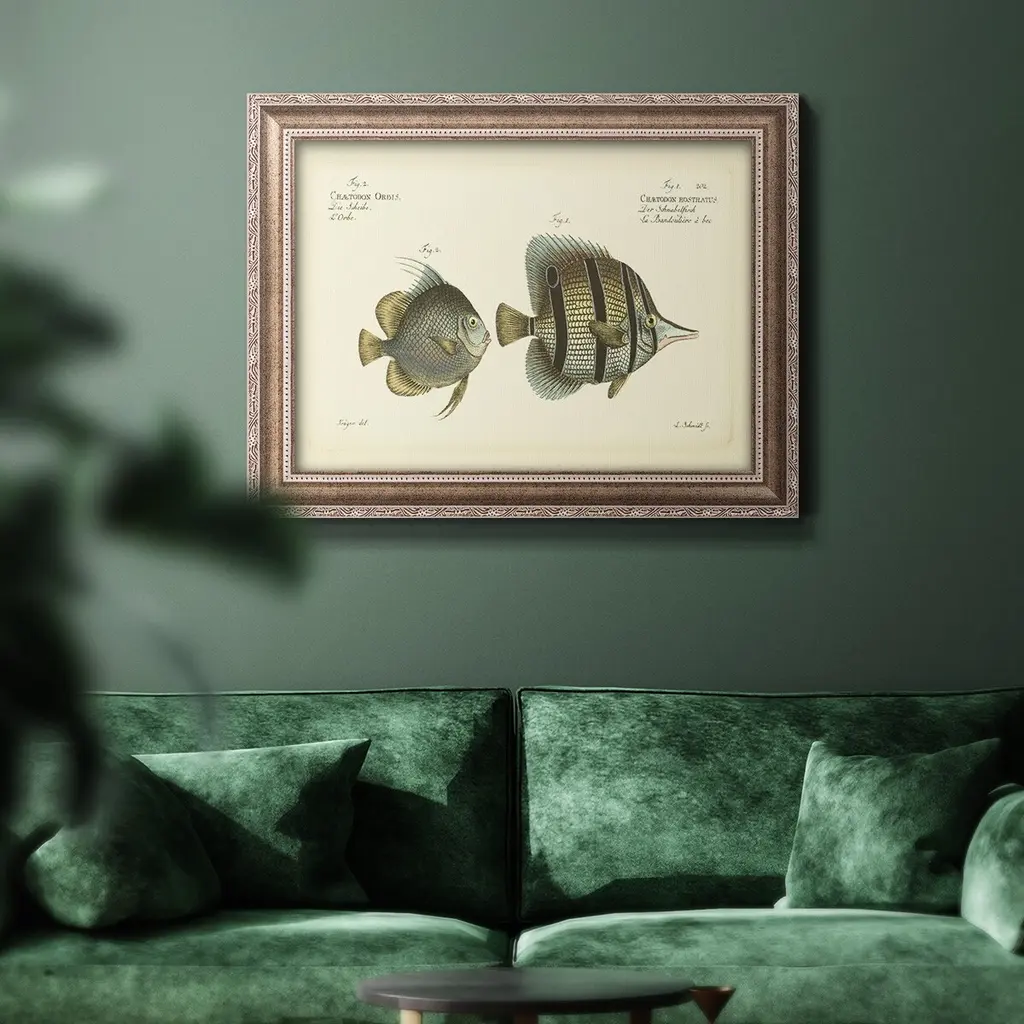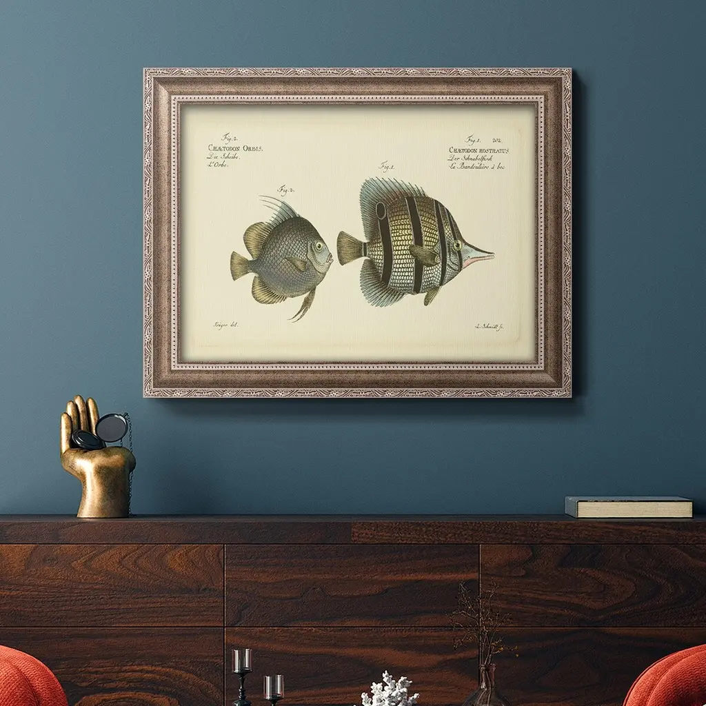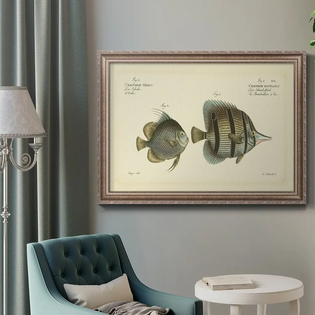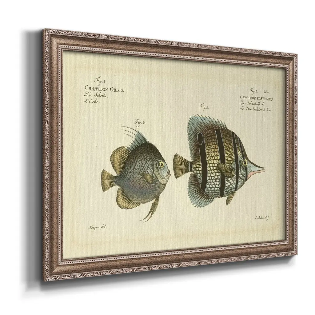 Bloch Antique Fish III Premium Framed Canvas- Ready to Hang A Premium Framed Canvas created to last. Framed in distressed wood and available in an array of sizes and colors Featuring a beveled a solid wood stretcher bar, each piece comes ready to hand 3 SIZES AVAILABLE 16''X20'' - Overall Size 18'X27'' - Overall Size 24''x36'' - Overall Size Each piece is made to order. Each piece comes with hanging hardware. Made in the USA Ready to Hang Giclee Paper Print Acrylic Glass Beveled Matt Board