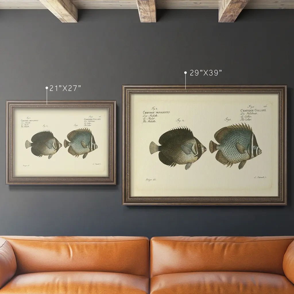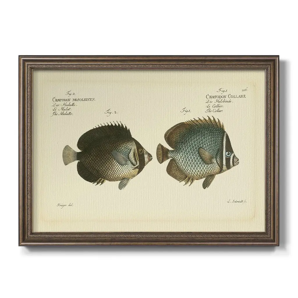 Bloch Antique Fish V Premium Framed Canvas- Ready to Hang A Premium Framed Canvas created to last. Framed in distressed wood and available in an array of sizes and colors Featuring a beveled a solid wood stretcher bar, each piece comes ready to hand 3 SIZES AVAILABLE 16''X20'' - Overall Size 18'X27'' - Overall Size 24''x36'' - Overall Size Each piece is made to order. Each piece comes with hanging hardware. Made in the USA Ready to Hang Giclee Paper Print Acrylic Glass Beveled Matt Board