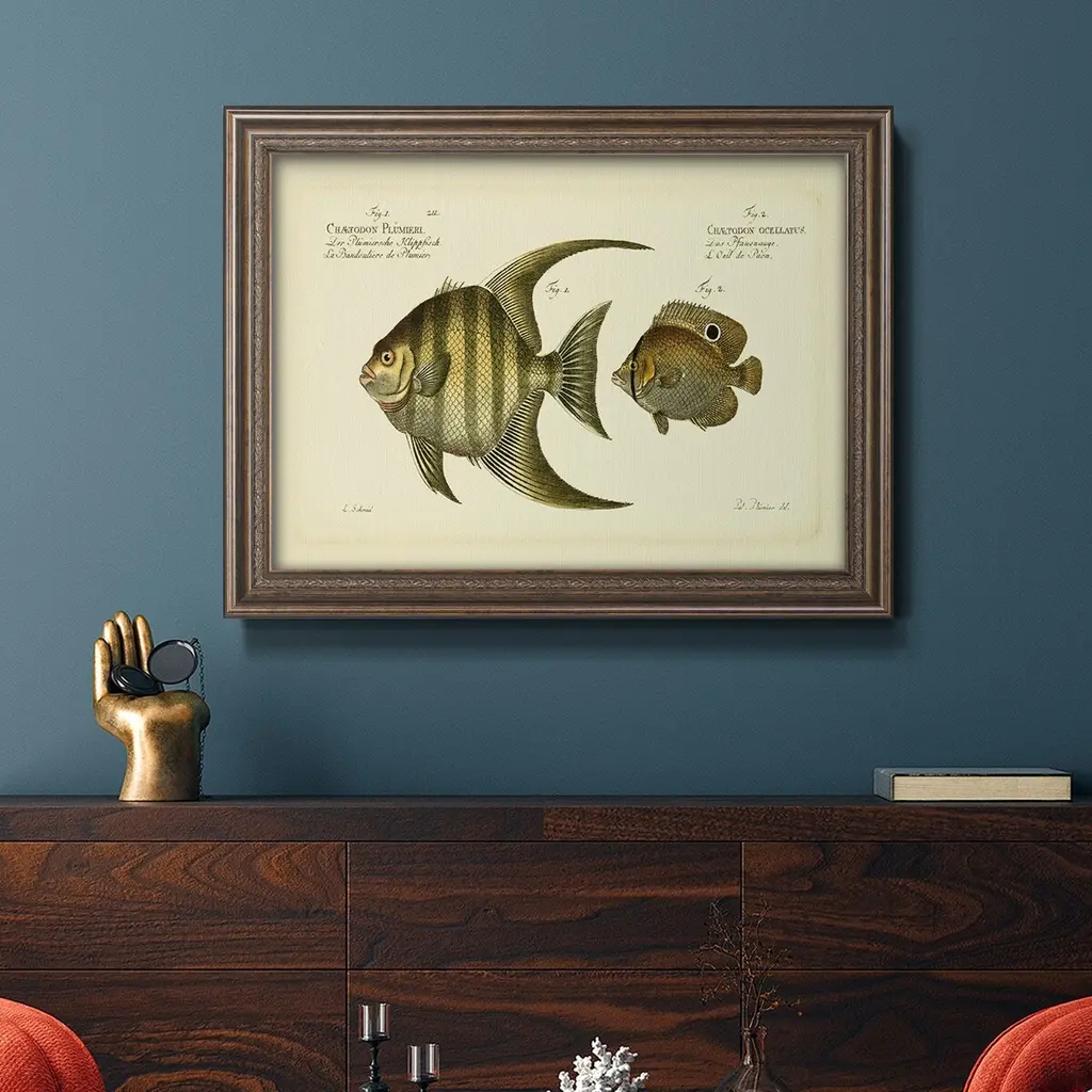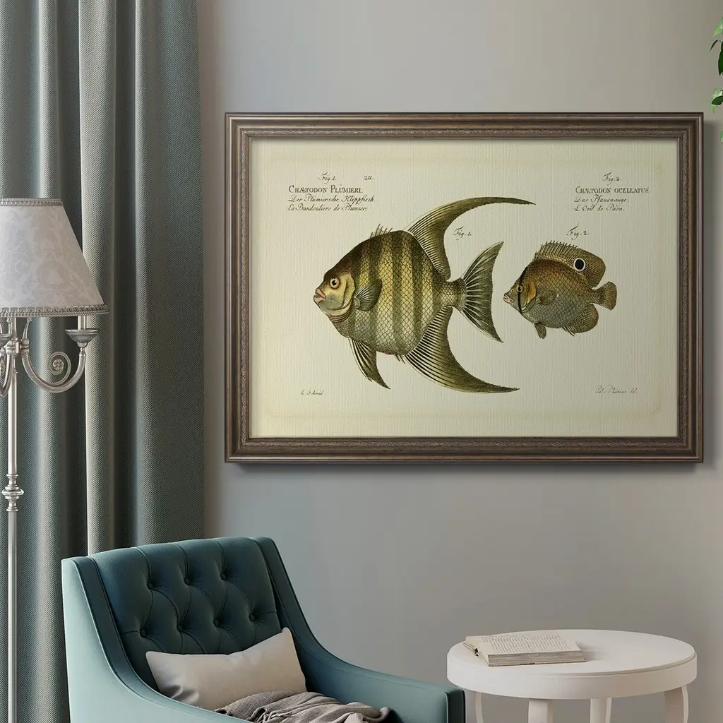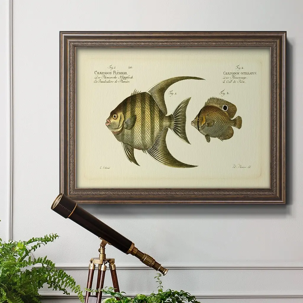Bloch Antique Fish VI Premium Framed Canvas- Ready to Hang A Premium Framed Canvas created to last. Framed in distressed wood and available in an array of sizes and colors Featuring a beveled a solid wood stretcher bar, each piece comes ready to hand 3 SIZES AVAILABLE 16''X20'' - Overall Size 18'X27'' - Overall Size 24''x36'' - Overall Size Each piece is made to order. Each piece comes with hanging hardware. Made in the USA Ready to Hang Giclee Paper Print Acrylic Glass Beveled Matt Board