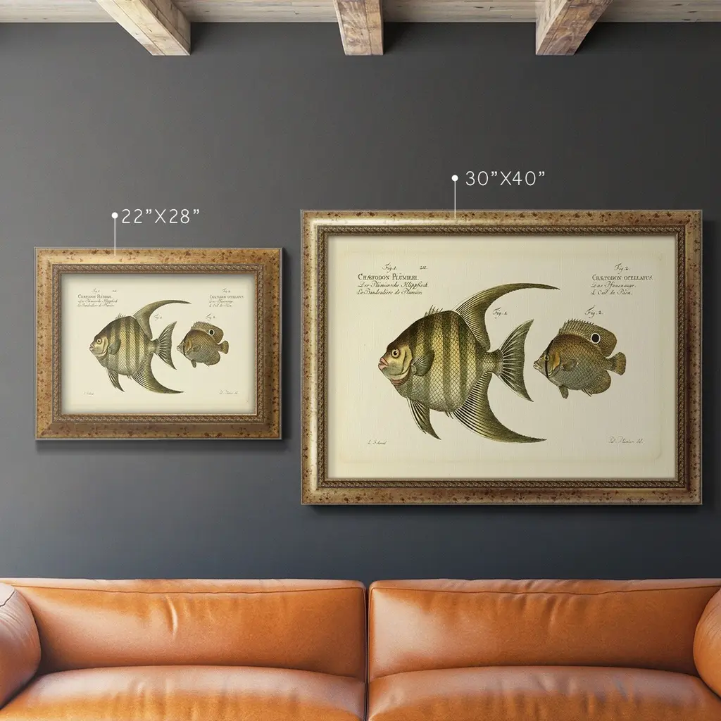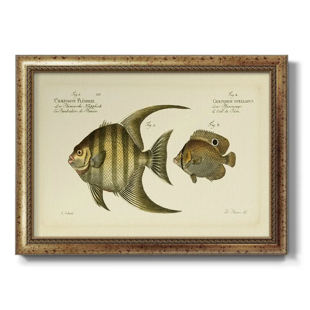 Bloch Antique Fish VI Premium Framed Canvas- Ready to Hang A Premium Framed Canvas created to last. Framed in distressed wood and available in an array of sizes and colors Featuring a beveled a solid wood stretcher bar, each piece comes ready to hand 3 SIZES AVAILABLE 16''X20'' - Overall Size 18'X27'' - Overall Size 24''x36'' - Overall Size Each piece is made to order. Each piece comes with hanging hardware. Made in the USA Ready to Hang Giclee Paper Print Acrylic Glass Beveled Matt Board