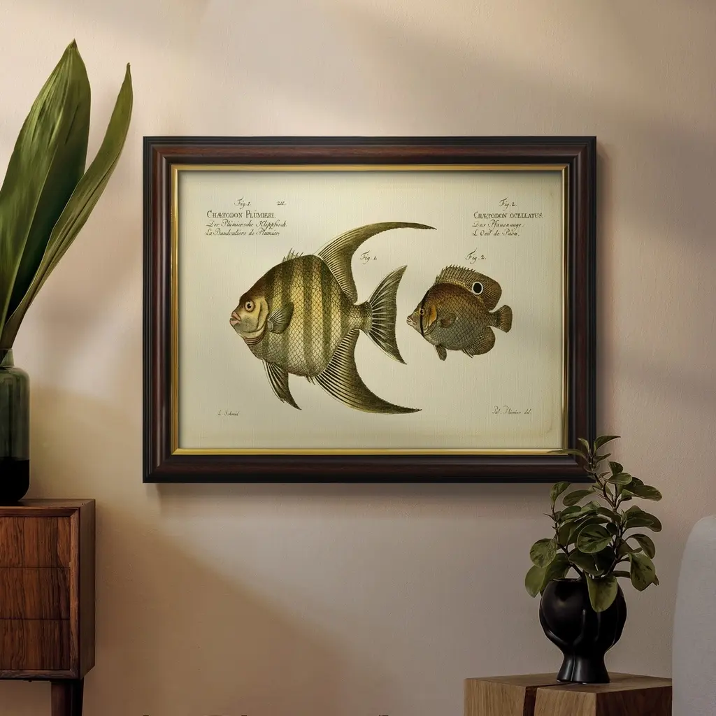 Bloch Antique Fish VI Premium Framed Canvas- Ready to Hang A Premium Framed Canvas created to last. Framed in distressed wood and available in an array of sizes and colors Featuring a beveled a solid wood stretcher bar, each piece comes ready to hand 3 SIZES AVAILABLE 16''X20'' - Overall Size 18'X27'' - Overall Size 24''x36'' - Overall Size Each piece is made to order. Each piece comes with hanging hardware. Made in the USA Ready to Hang Giclee Paper Print Acrylic Glass Beveled Matt Board
