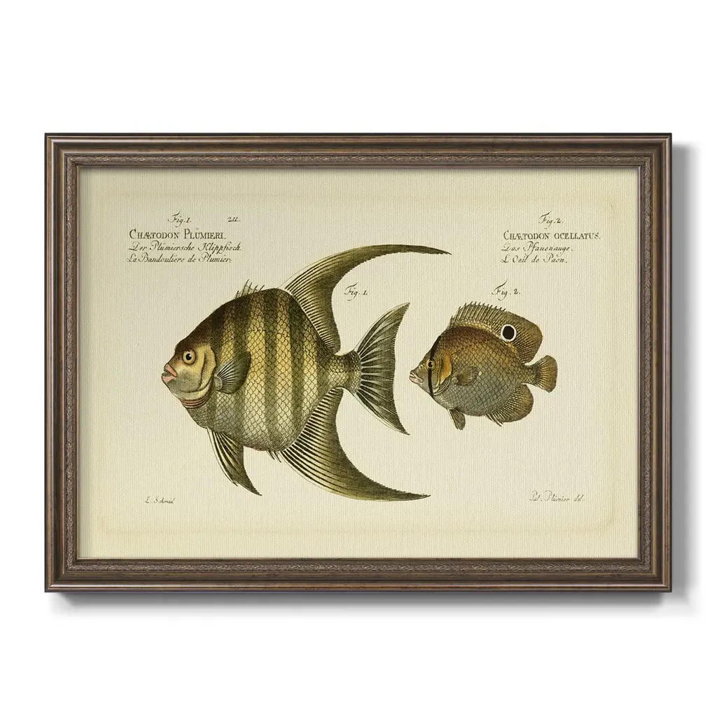 Bloch Antique Fish VI Premium Framed Canvas- Ready to Hang A Premium Framed Canvas created to last. Framed in distressed wood and available in an array of sizes and colors Featuring a beveled a solid wood stretcher bar, each piece comes ready to hand 3 SIZES AVAILABLE 16''X20'' - Overall Size 18'X27'' - Overall Size 24''x36'' - Overall Size Each piece is made to order. Each piece comes with hanging hardware. Made in the USA Ready to Hang Giclee Paper Print Acrylic Glass Beveled Matt Board