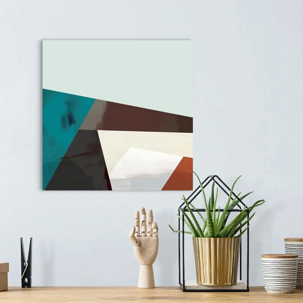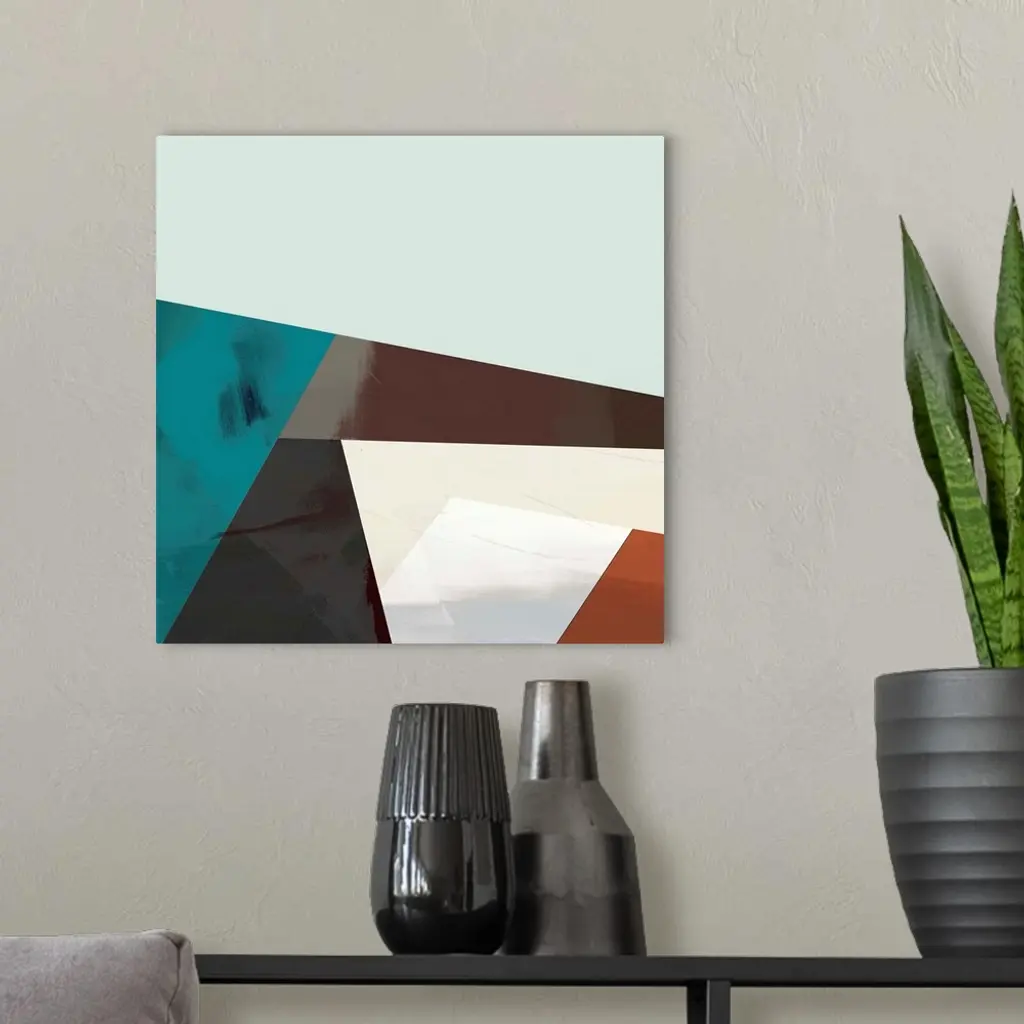 Modern abstract artwork of angular shapes in brown, red, and teal.