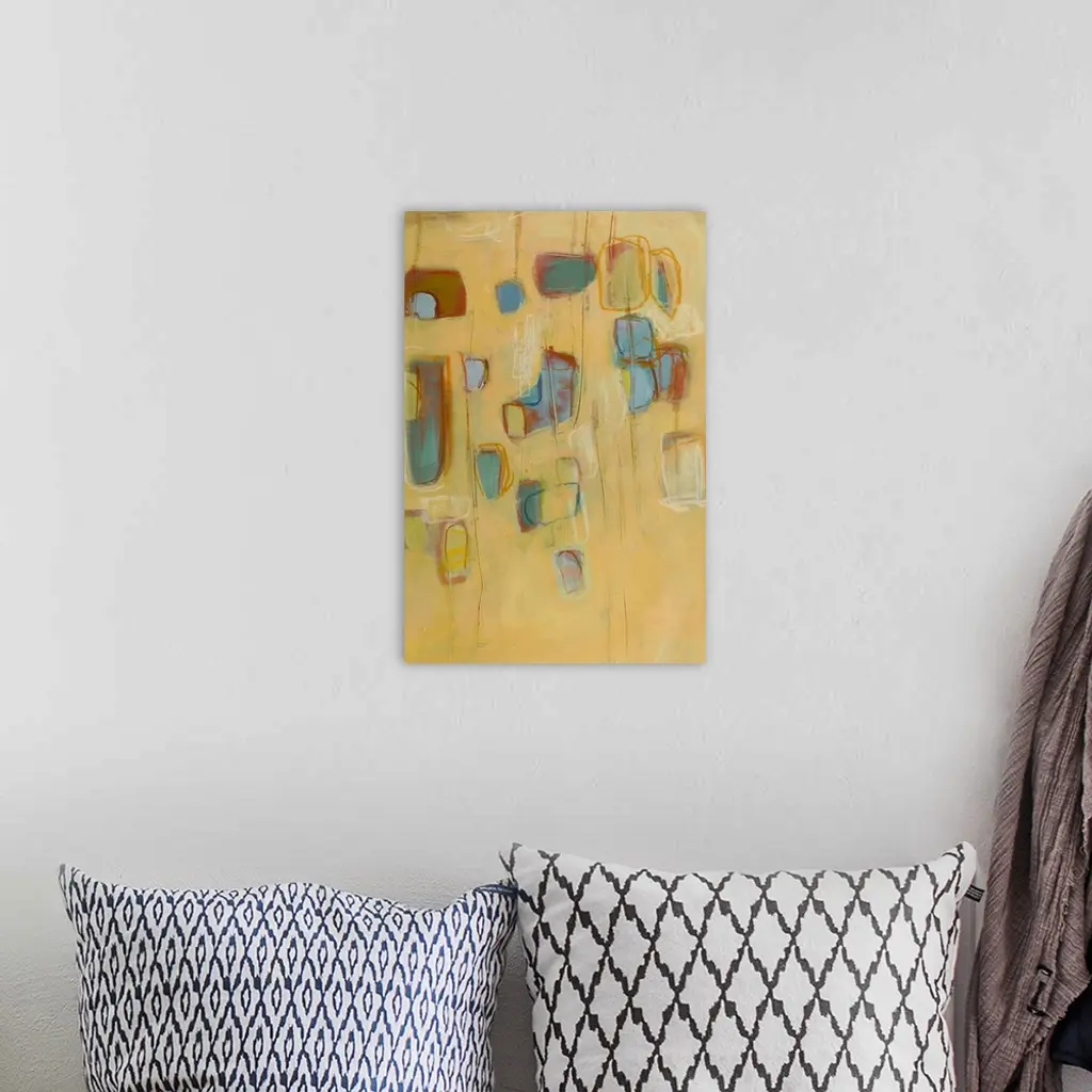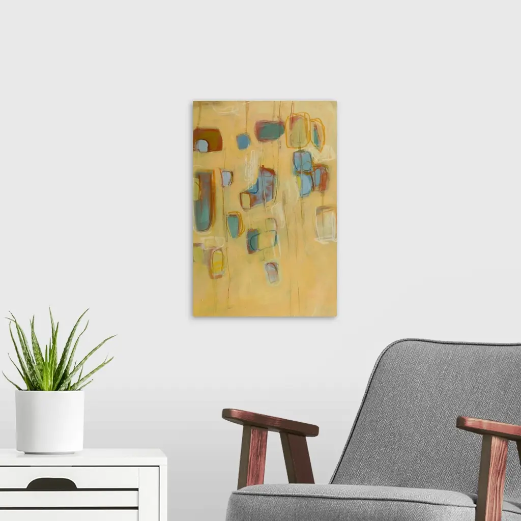 Retro mid-century style abstract painting using soft geometric shapes and muted colors.