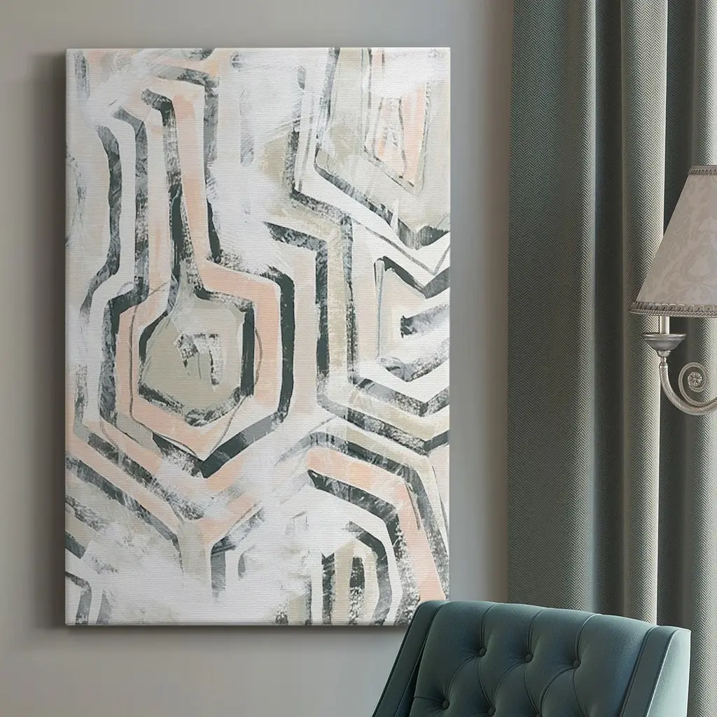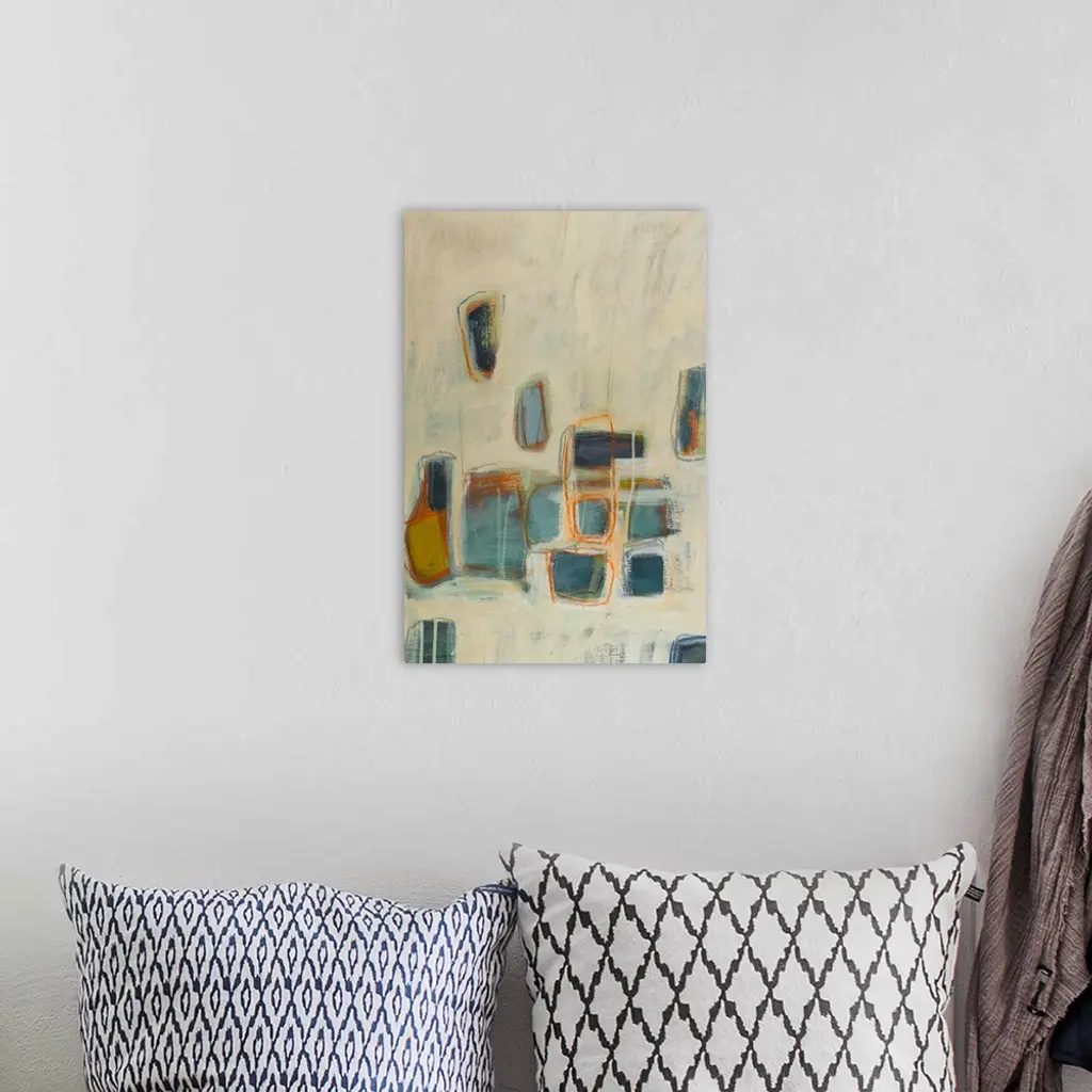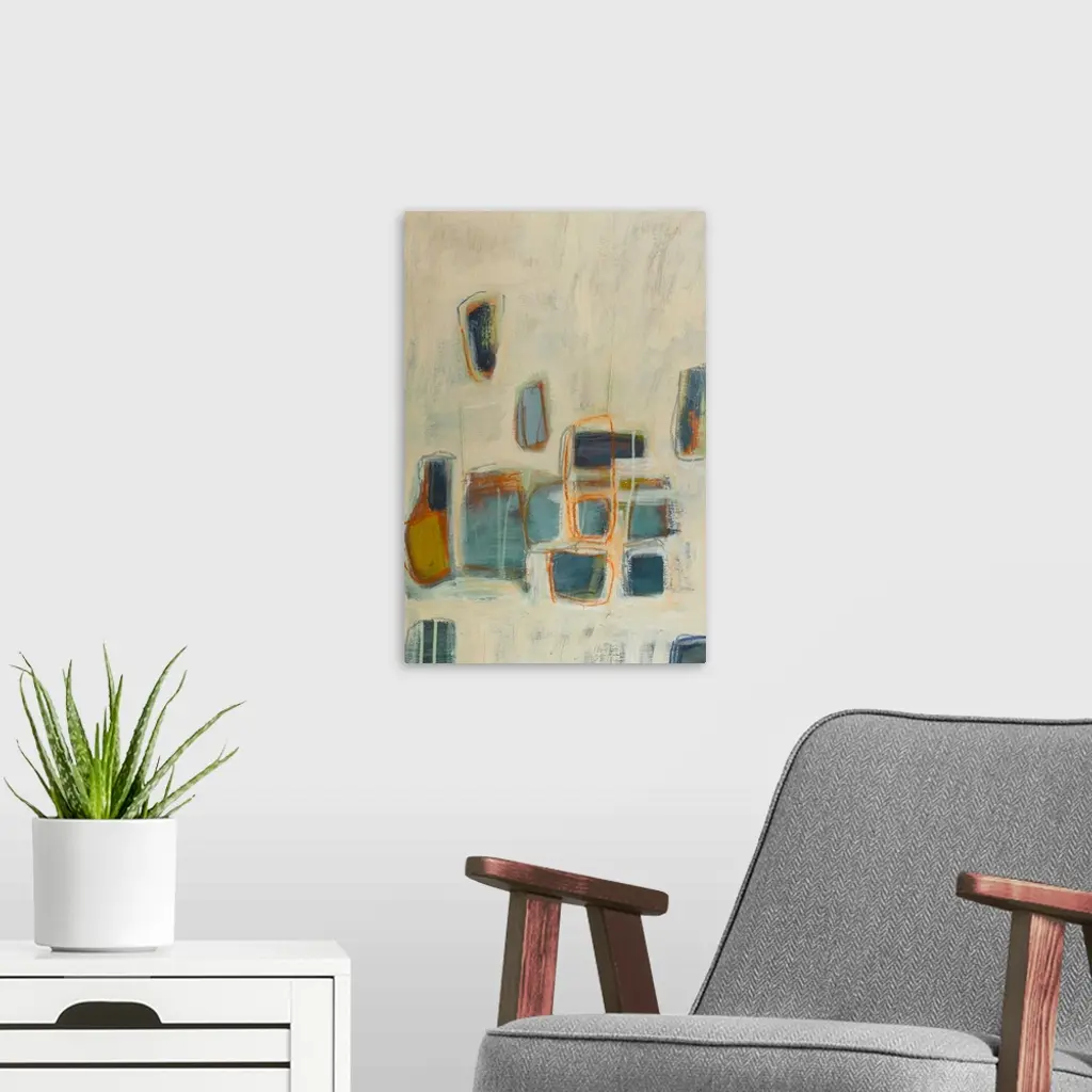 Retro mid-century style abstract painting using soft geometric shapes and muted colors.