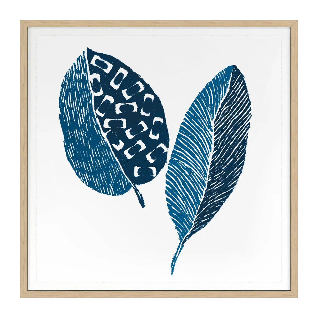 The Indigo Block Print Leaf Wall Art features a block-print leaf design in rich indigo on pristine archival paper. Each print is meticulously hand-torn and floated in a Nordic Oak frame, adding depth and dimension. This piece exudes natural beauty and elegant simplicity that will enliven your walls.