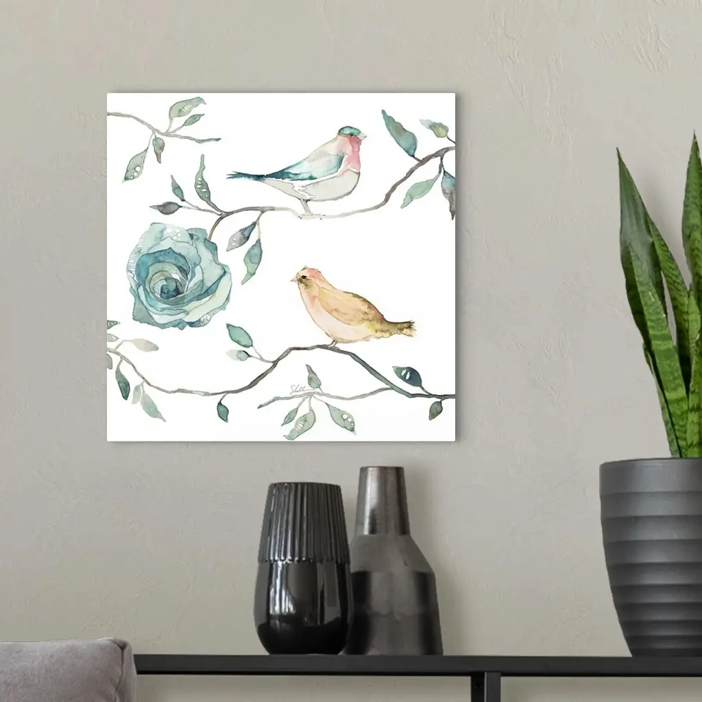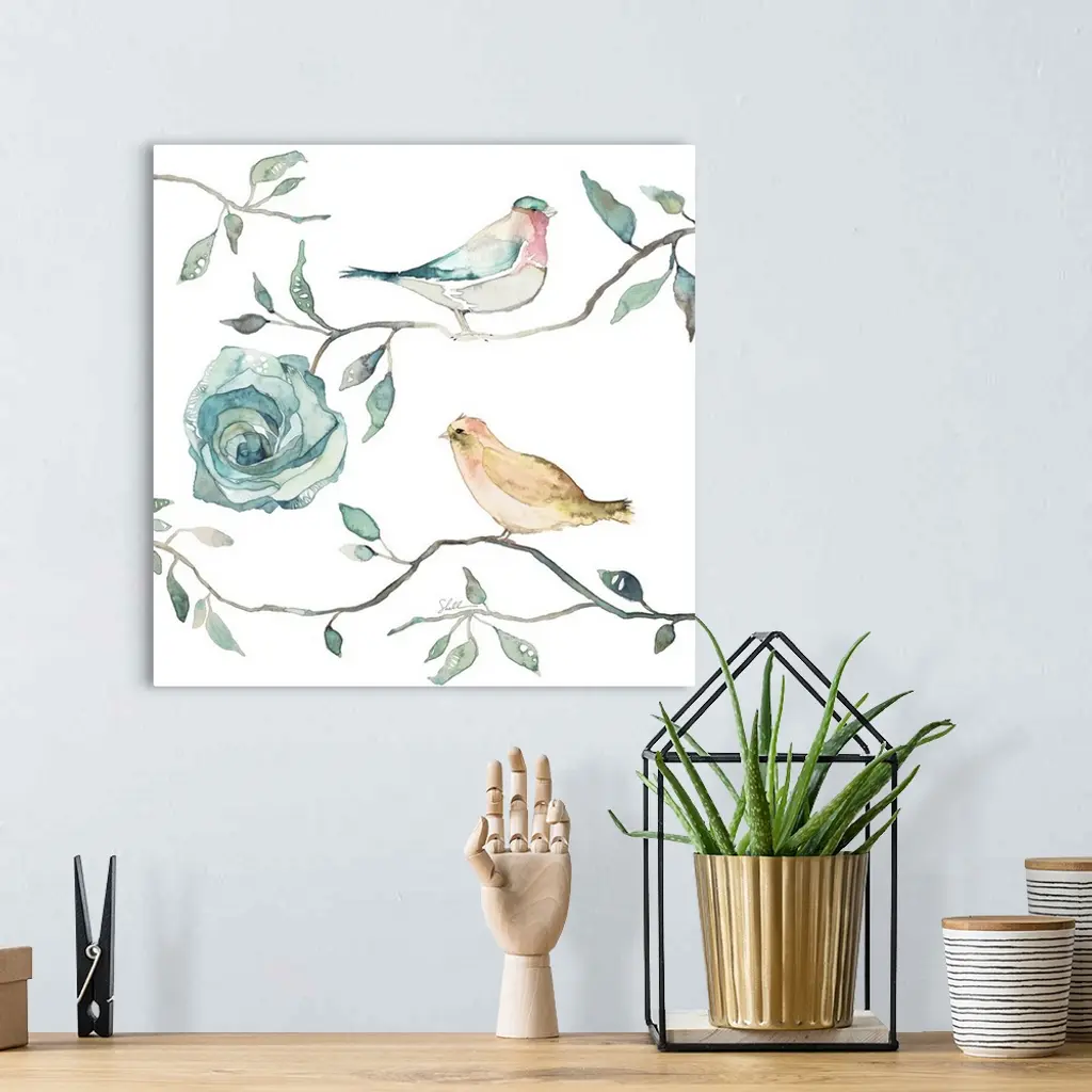 Hand painted watercolor painting of two birds on branches with roses and leaves