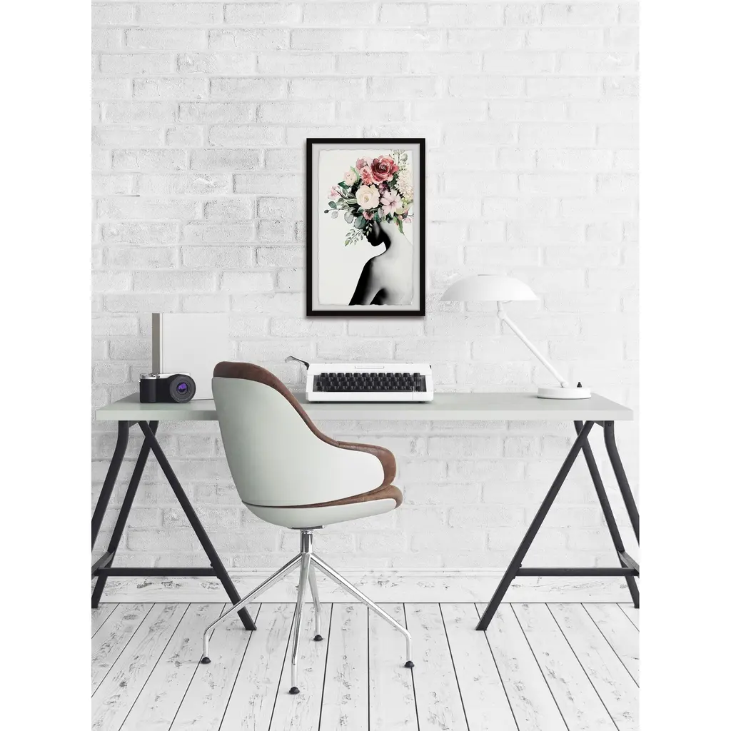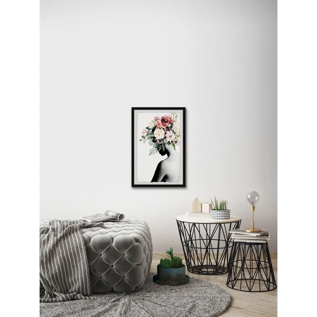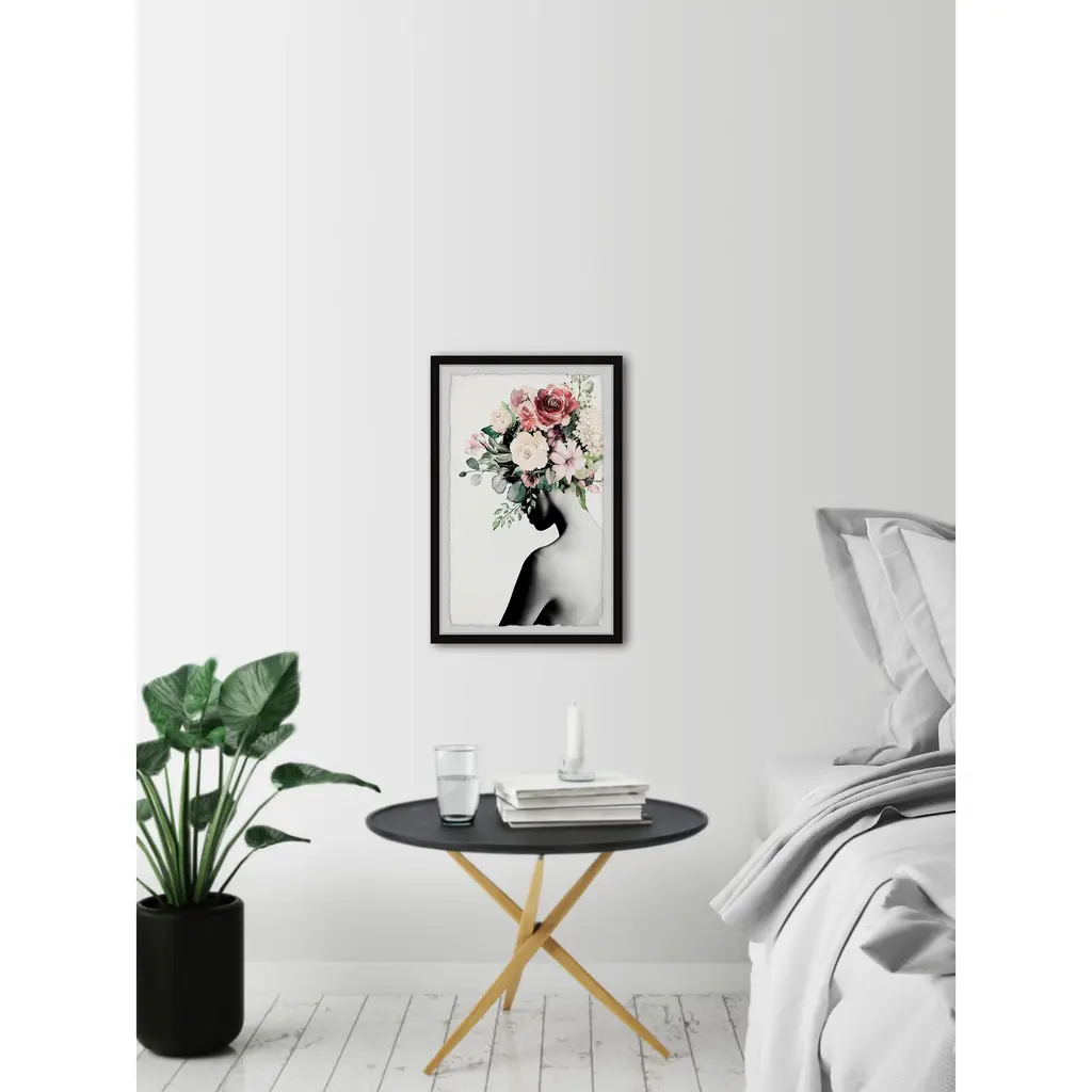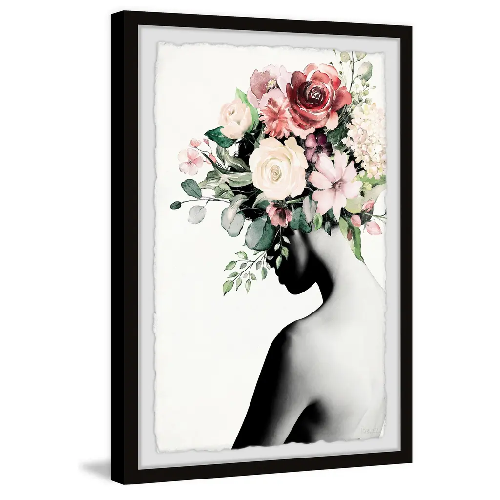 Add an abstract accent to your contemporary space with this "Blooming Back" print. The giclee print displays a black and white silhouette with blooming florals and hand-cut deckled edges. Choose from six sizes that each included a non-warping black frame.Features: