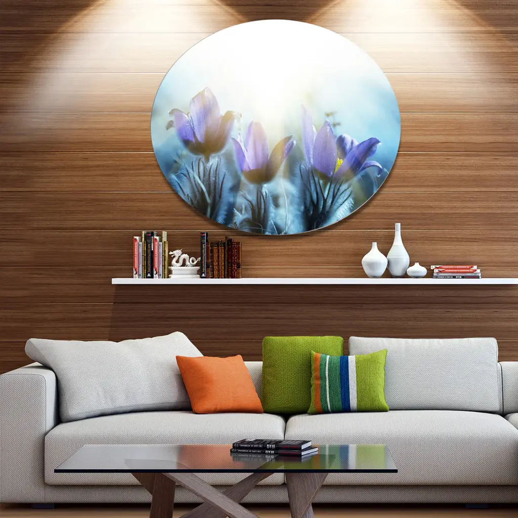 Bring Contemporary Abstraction to your home with this large Circle Metal wall art. This Blooming Blue Spring Flowers Metal Artwork makes it the focal point of any room or office. - White Gloss Coating ensures colors are extra vibrant with light reflection.- Aluminum grade Sheet Metal with 1 inch mounting frame on the back giving the illusion that the artwork is floating on the wall..- Mounting Brackets are included along with instructions.- High Quality Digital images are created directly into a glossy aluminum panel producing a stunning and captivating print into the glossy finish of the metal.- Water, Fire and Scratch resistant HD Aluminum panels.- Looks better than any photo paper and guaranteed to last at least 20 years- Easy to clean with a microfiber cloth. Colors are far superior to regular Canvas Art. - Easy to Hang