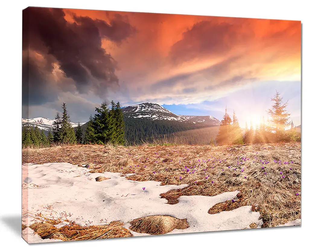 The Blooming Crocuses in Mountains canvas art print is sure to make an impression on anyone who sees it. This artwork is gallery wrapped around a 1-inch solid wood frame and arrives carefully packaged and entirely ready to hang on the wall. Design Art only uses the highest resolution and pigments to ensure a crisp colorful print that is never faded or pixelated. This artwork is sure to be a conversation starter in any home or office.