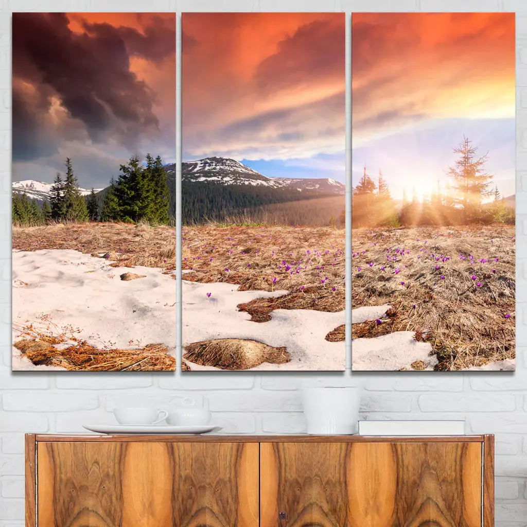 "Blooming Crocuses In Mountains" Photo Canvas Print, 3 Panels, 36"x28"