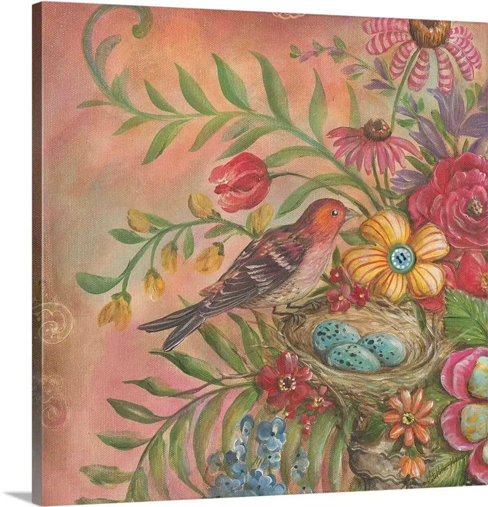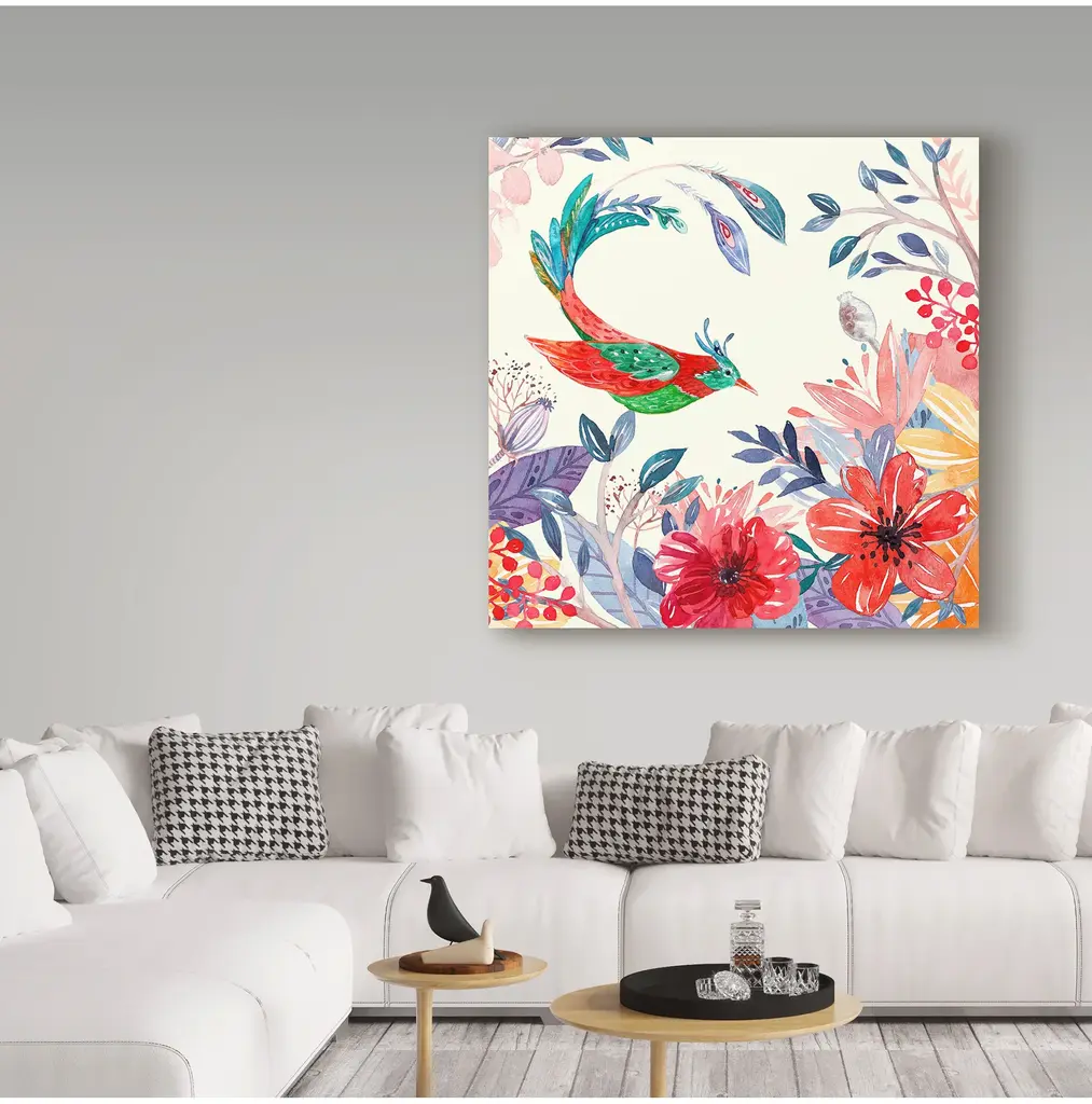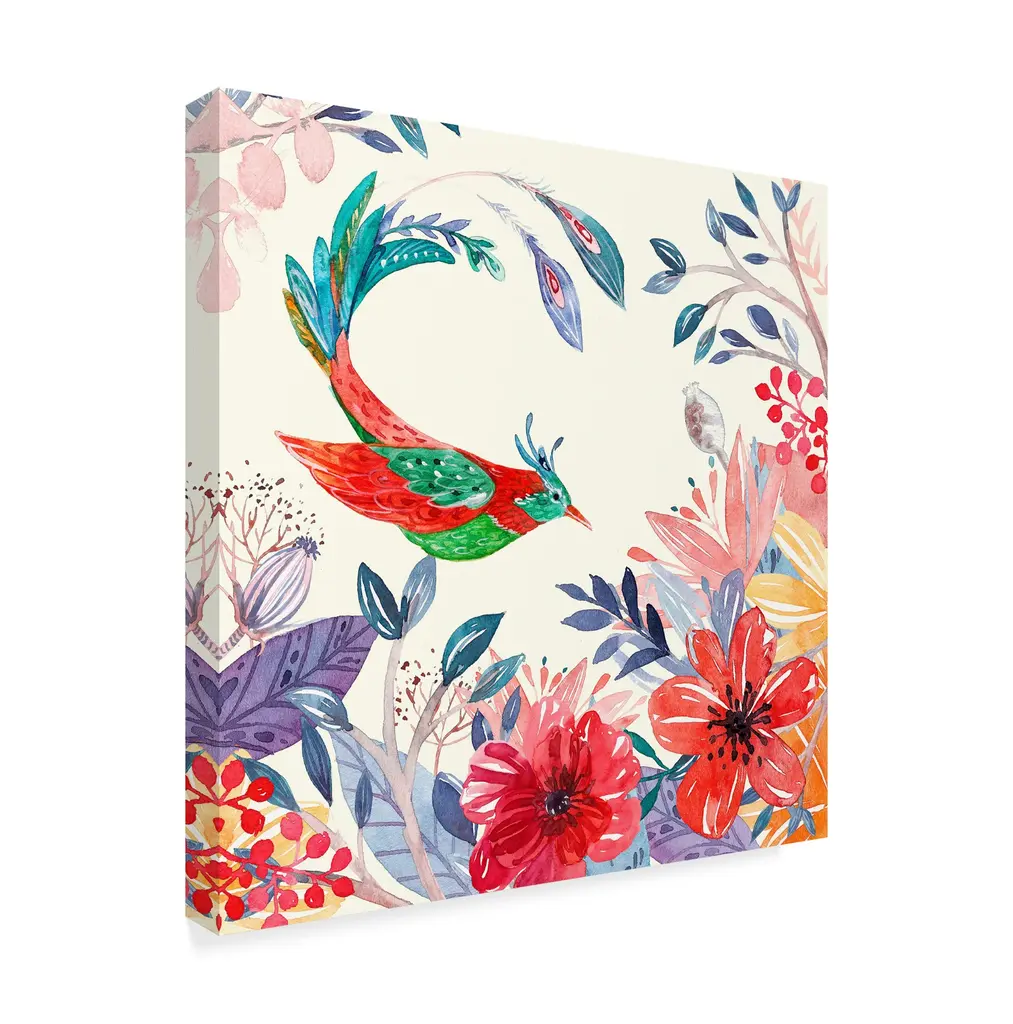Artist: Irina Trzaskos StudioSubject: FloralStyle: Mid-Century ModernProduct Type: Gallery-Wrapped Canvas ArtMade in USAThis ready to hang, gallery-wrapped art piece features a colorful bird over a floral scene.Connecticut based artist, designer and illustrator, Irina Trzaskos, is best known for her elegant and colorful watercolor style. Her artwork is inspired by culture, art history and nature. She was born and grew up in Moldova. After earning her degree in Interior Design, Irina worked as an interior designer for a textile company, and as an administrator of one of the largest antique furniture importing companies, in Chisinau the capital of Moldova. In 2012 Irina moved to United States, following her heart and fulfilling her dream of becoming an artist.Giclee (jee-clay) is an advanced printmaking process for creating high quality fine art reproductions. The attainable excellence that Giclee printmaking affords makes the reproduction virtually indistinguishable from the original piece. The result is wide acceptance of Giclee by galleries, museums, and private collectors. Gallery wrap is a method of stretching an artist's canvas so that the canvas wraps around the sides and is secured a hidden, wooden frame. This method of stretching and preparing a canvas allows for a frameless presentation of the finished painting.