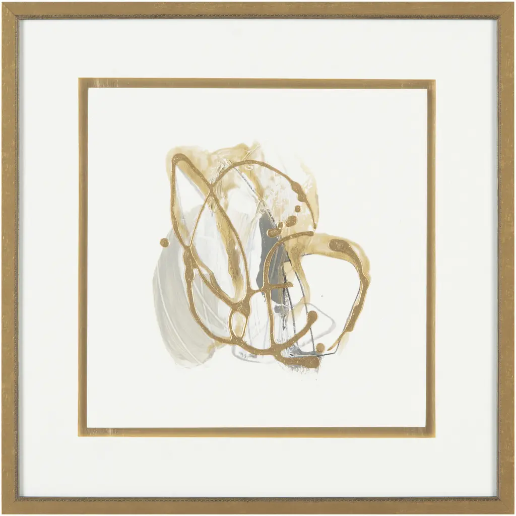 This abstract titled Blooming Gold describes the design. The background shows a line of gold leaf on a custom-painted mat in a cream color. The art is framed in a narrow wood molding with a gold finish.
