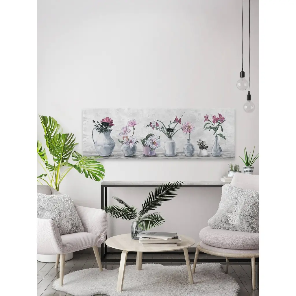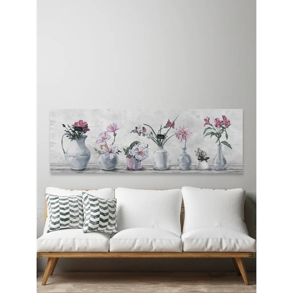 Watering cans and milk jars make up rustic and homey vases for lovely pink flowers in this peaceful acrylic print perfect for bringing some countryside charm into your home, wherever you live. Proudly made in the USA, this piece is printed on canvas before it's stretched over non-warping wooden bars for a gallery-wrapped look. With wall-mounting hooks included, this artful accent is ready to hang up as soon as it reaches your front door. • Fine art canvas print from the Marmont Hill Art Collective • Professionally hand stretched • Gallery wrapped in sustainable, non-warping wood • Arrives ready to hang • Made in the USA • Includes a certificate of authenticity