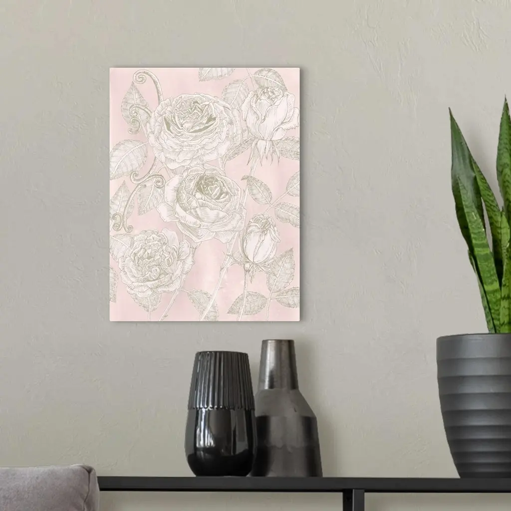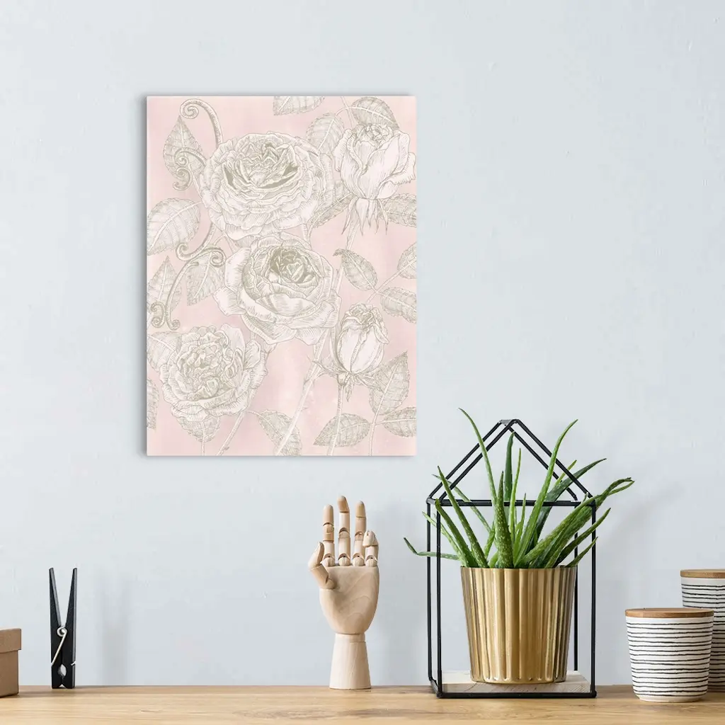 This decorative artwork features illustrated roses in subdued beige and white over a soft pink background.