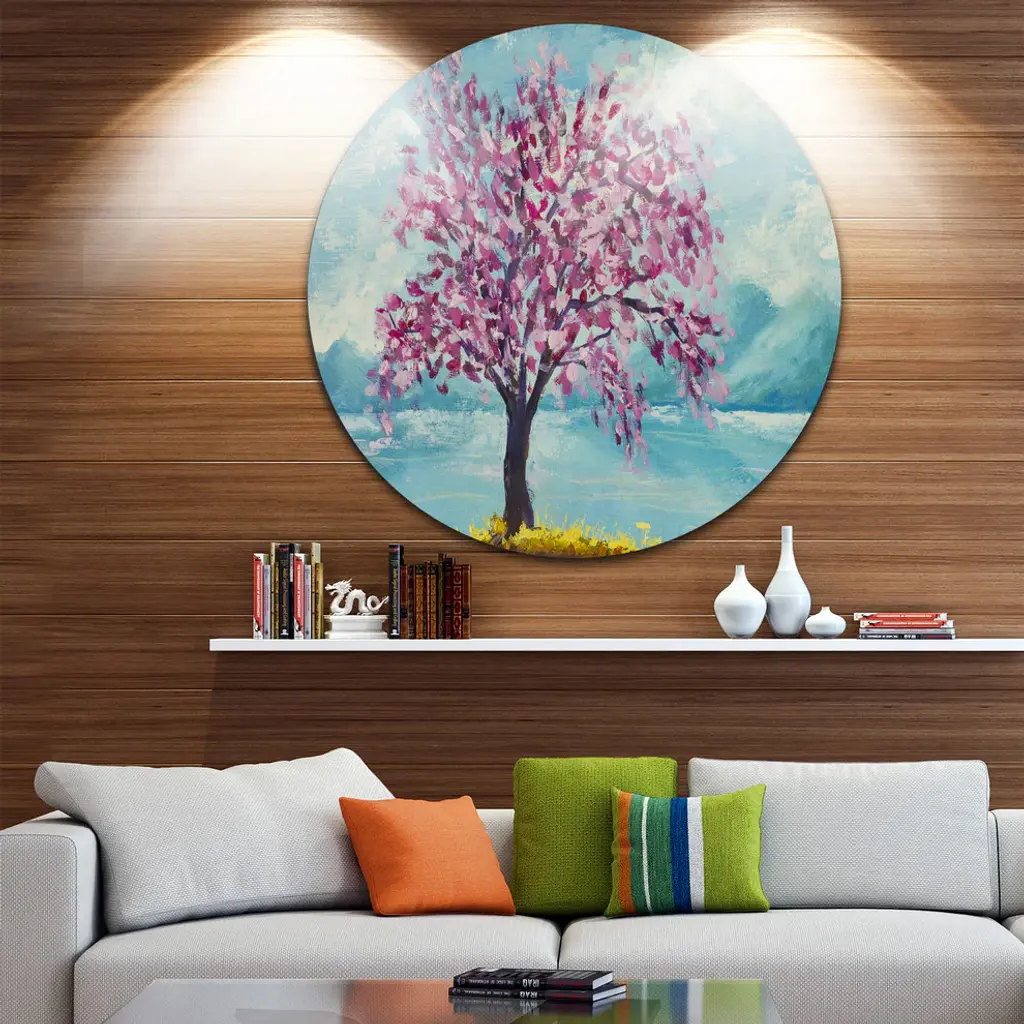 Bring Contemporary Abstraction to your home with this large Circle Metal wall art. This Blooming Sakura Flowers Metal Artwork makes it the focal point of any room or office. - White Gloss Coating ensures colors are extra vibrant with light reflection.- Aluminum grade Sheet Metal with 1 inch mounting frame on the back giving the illusion that the artwork is floating on the wall..- Mounting Brackets are included along with instructions.- High Quality Digital images are created directly into a glossy aluminum panel producing a stunning and captivating print into the glossy finish of the metal.- Water, Fire and Scratch resistant HD Aluminum panels.- Looks better than any photo paper and guaranteed to last at least 20 years- Easy to clean with a microfiber cloth. Colors are far superior to regular Canvas Art. - Easy to Hang