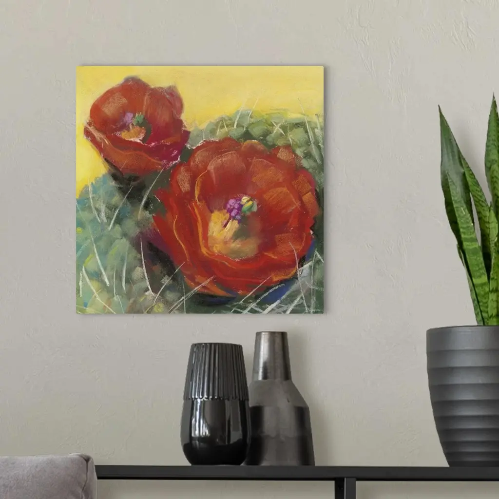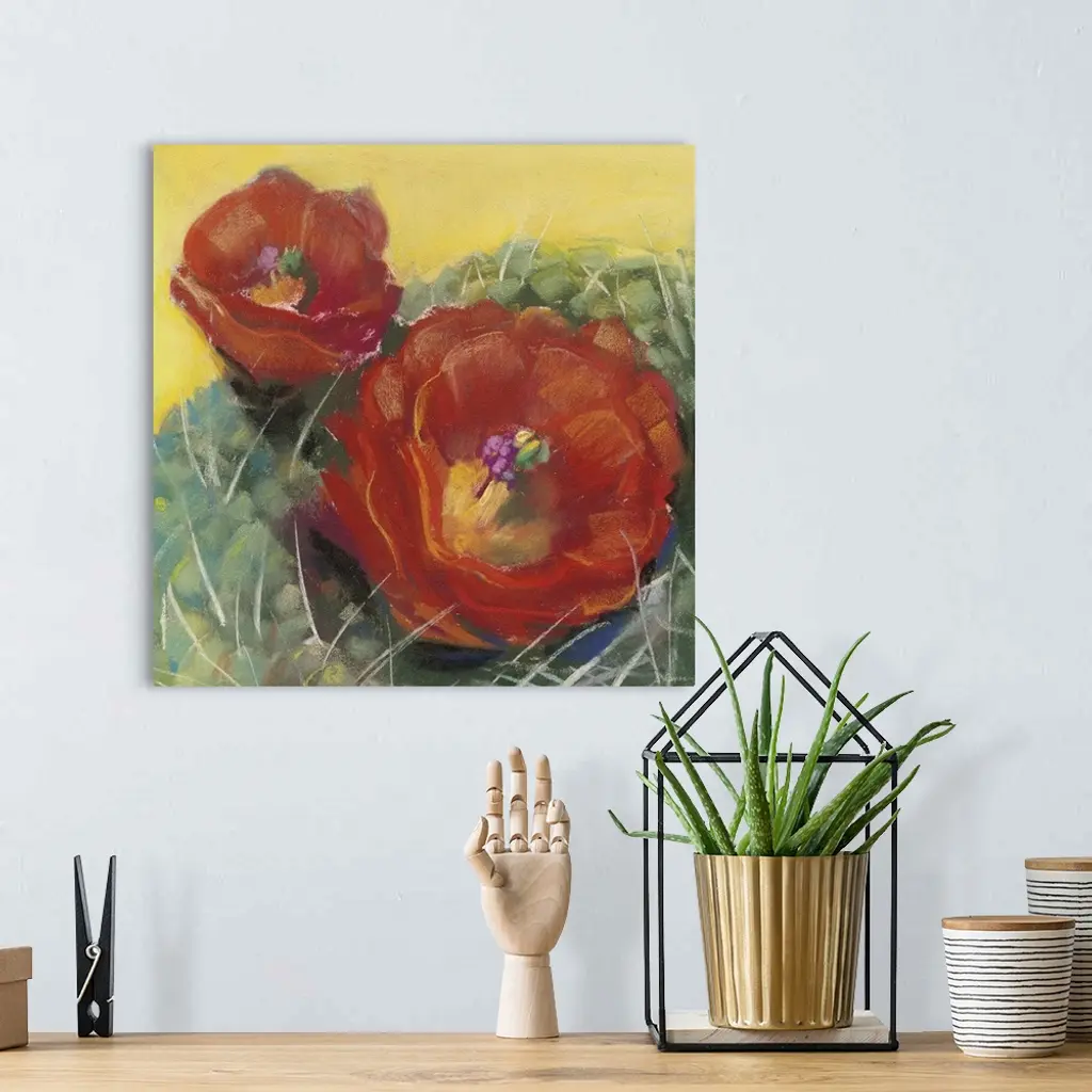 A square contemporary painting of red blooms on a cactus with a yellow background.
