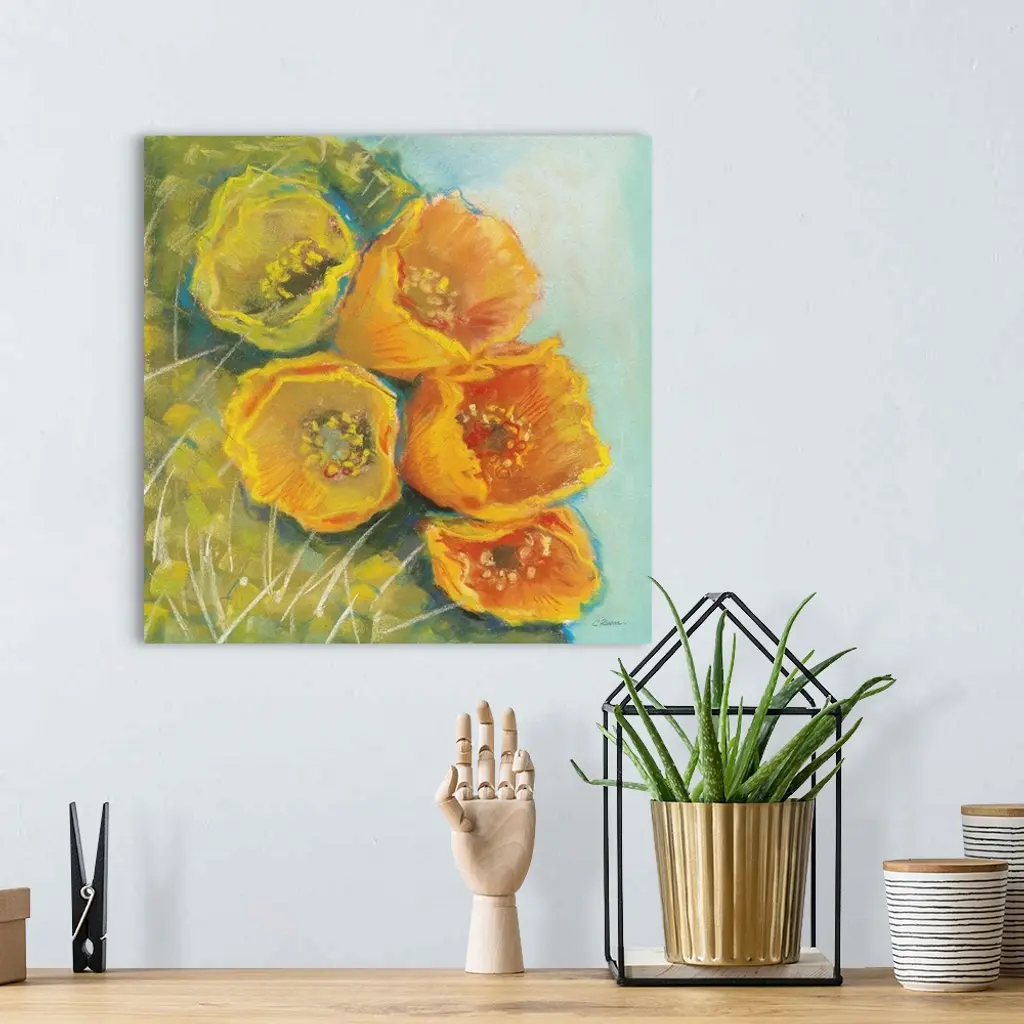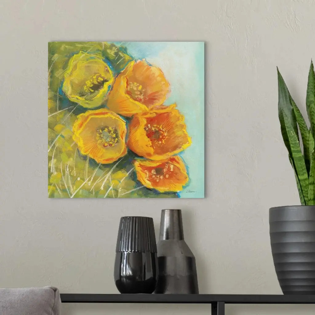A square contemporary painting of yellow blooms on a cactus with a blue background.