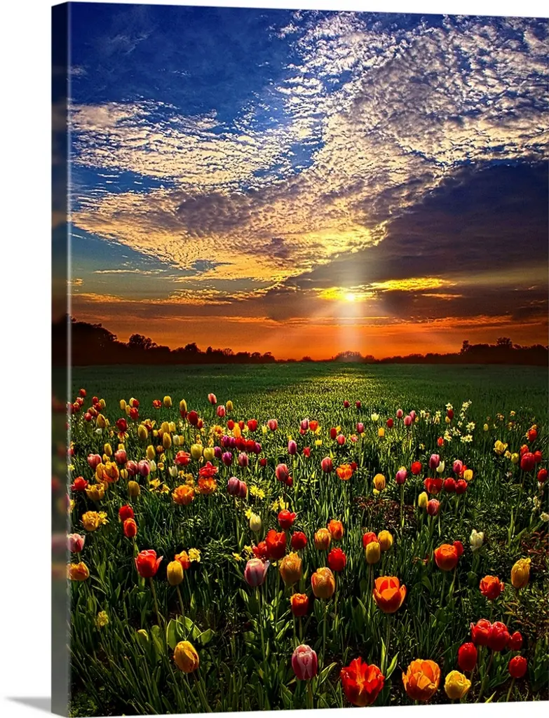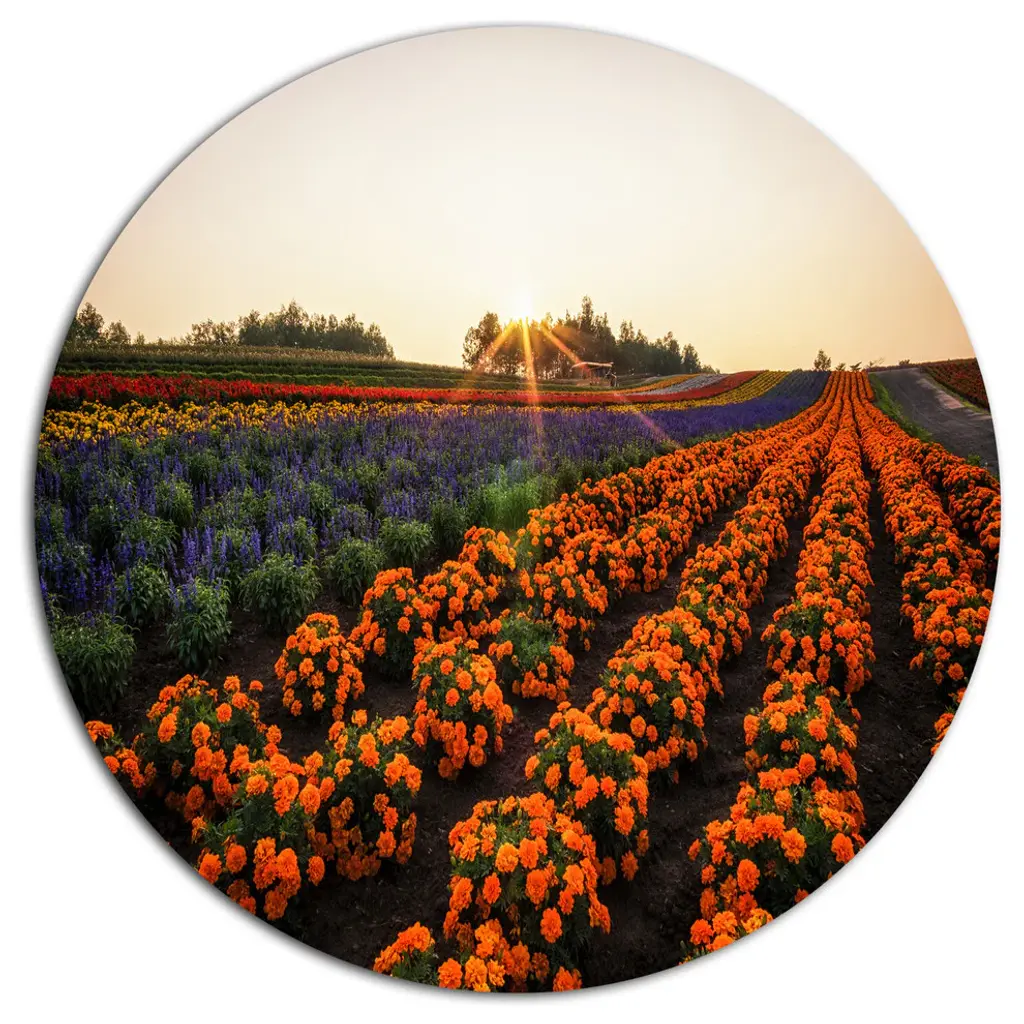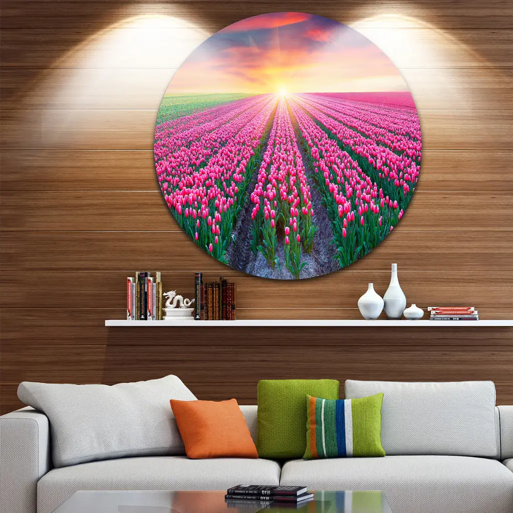 Bring Contemporary Abstraction to your home with this large Circle Metal wall art. This Blooming Tulips at Sunrise Metal Artwork makes it the focal point of any room or office. - White Gloss Coating ensures colors are extra vibrant with light reflection.- Aluminum grade Sheet Metal with 1 inch mounting frame on the back giving the illusion that the artwork is floating on the wall..- Mounting Brackets are included along with instructions.- High Quality Digital images are created directly into a glossy aluminum panel producing a stunning and captivating print into the glossy finish of the metal.- Water, Fire and Scratch resistant HD Aluminum panels.- Looks better than any photo paper and guaranteed to last at least 20 years- Easy to clean with a microfiber cloth. Colors are far superior to regular Canvas Art. - Easy to Hang