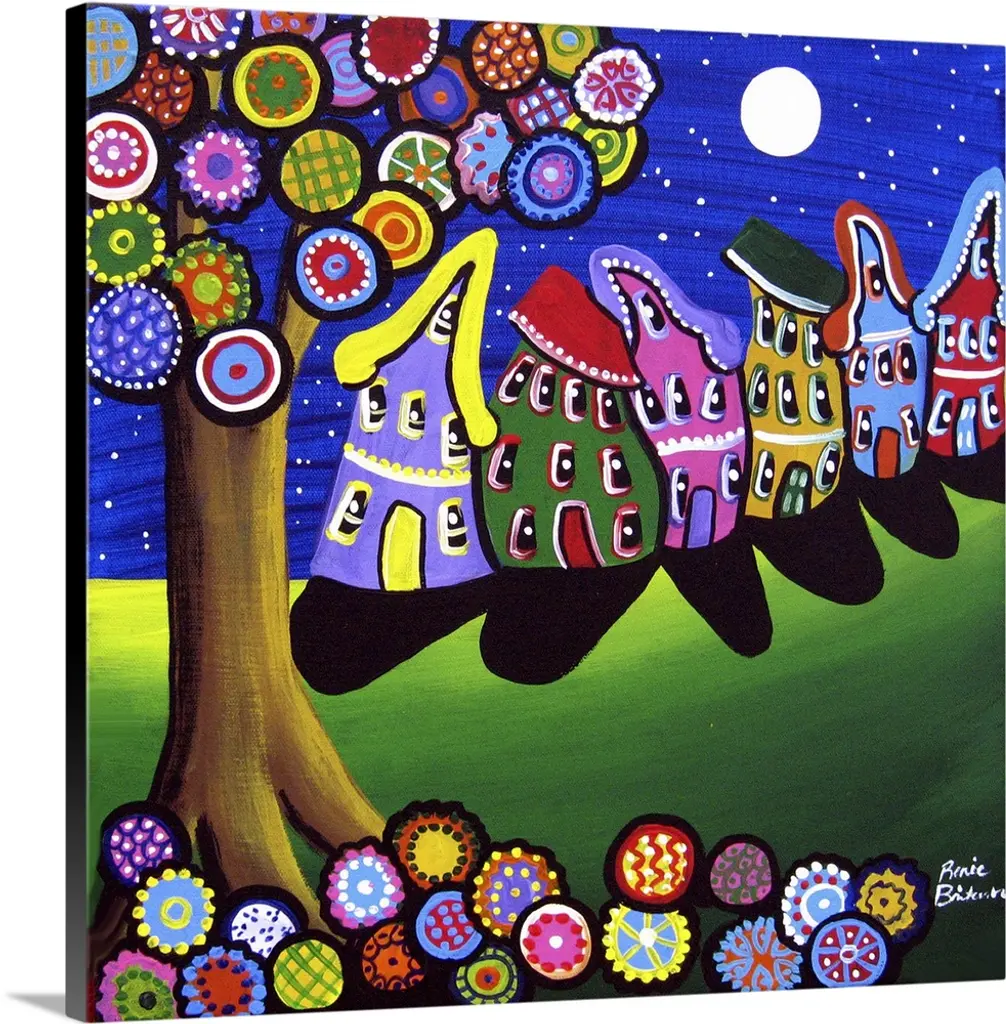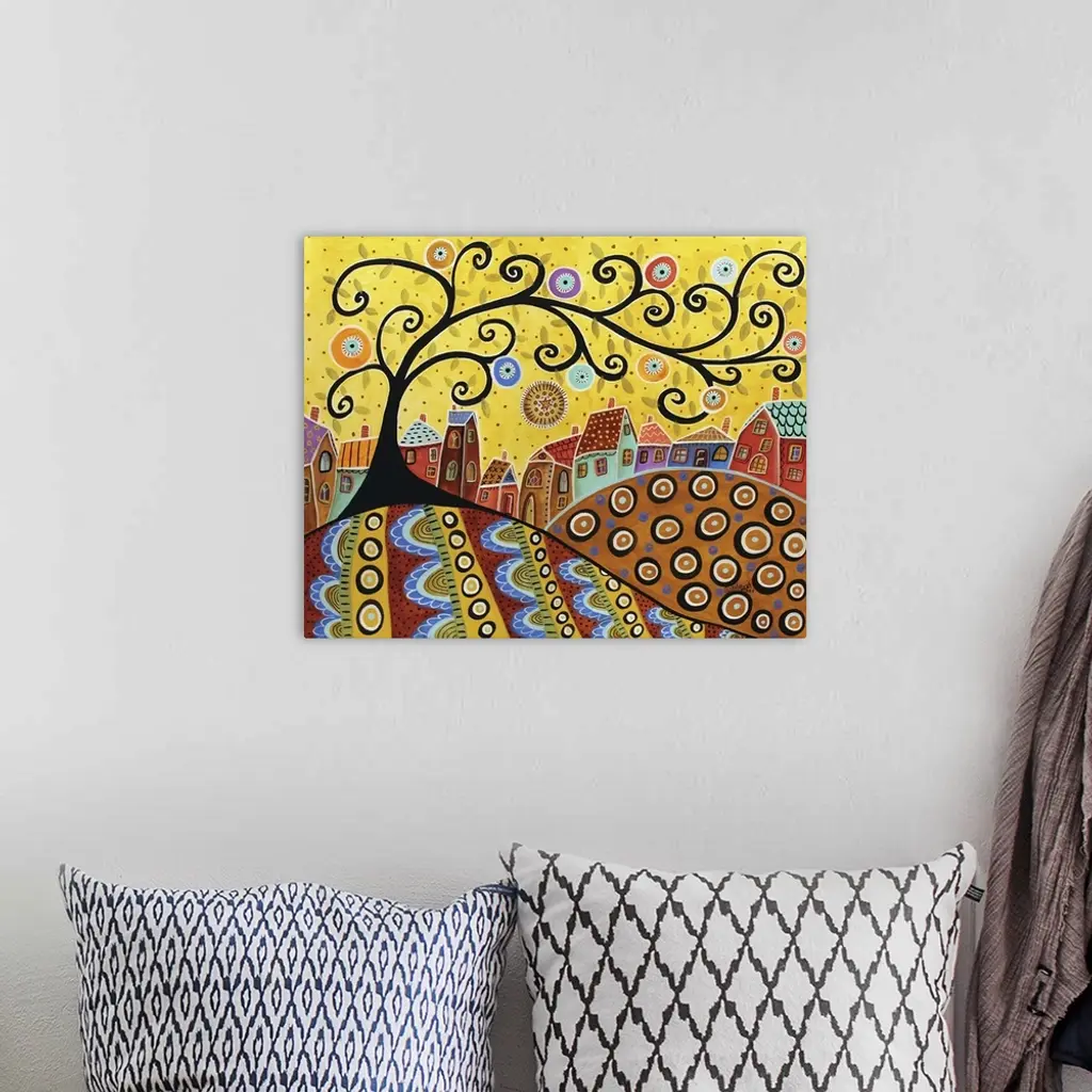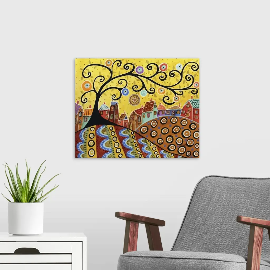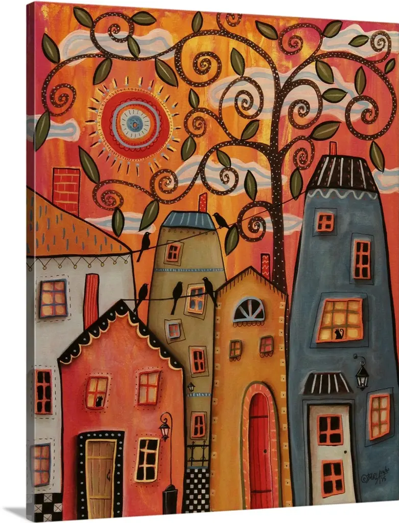 Contemporary painting of a village made of different colored houses with a large tree with curly branches.