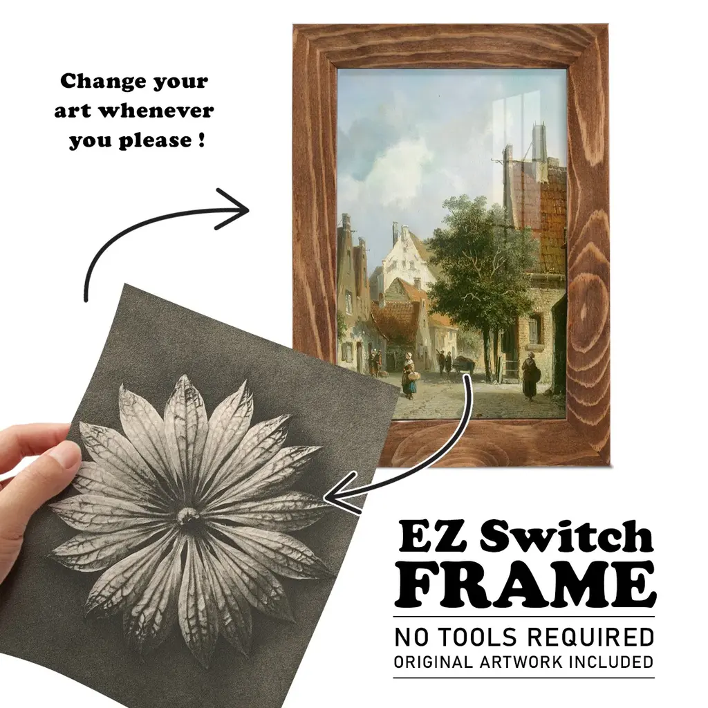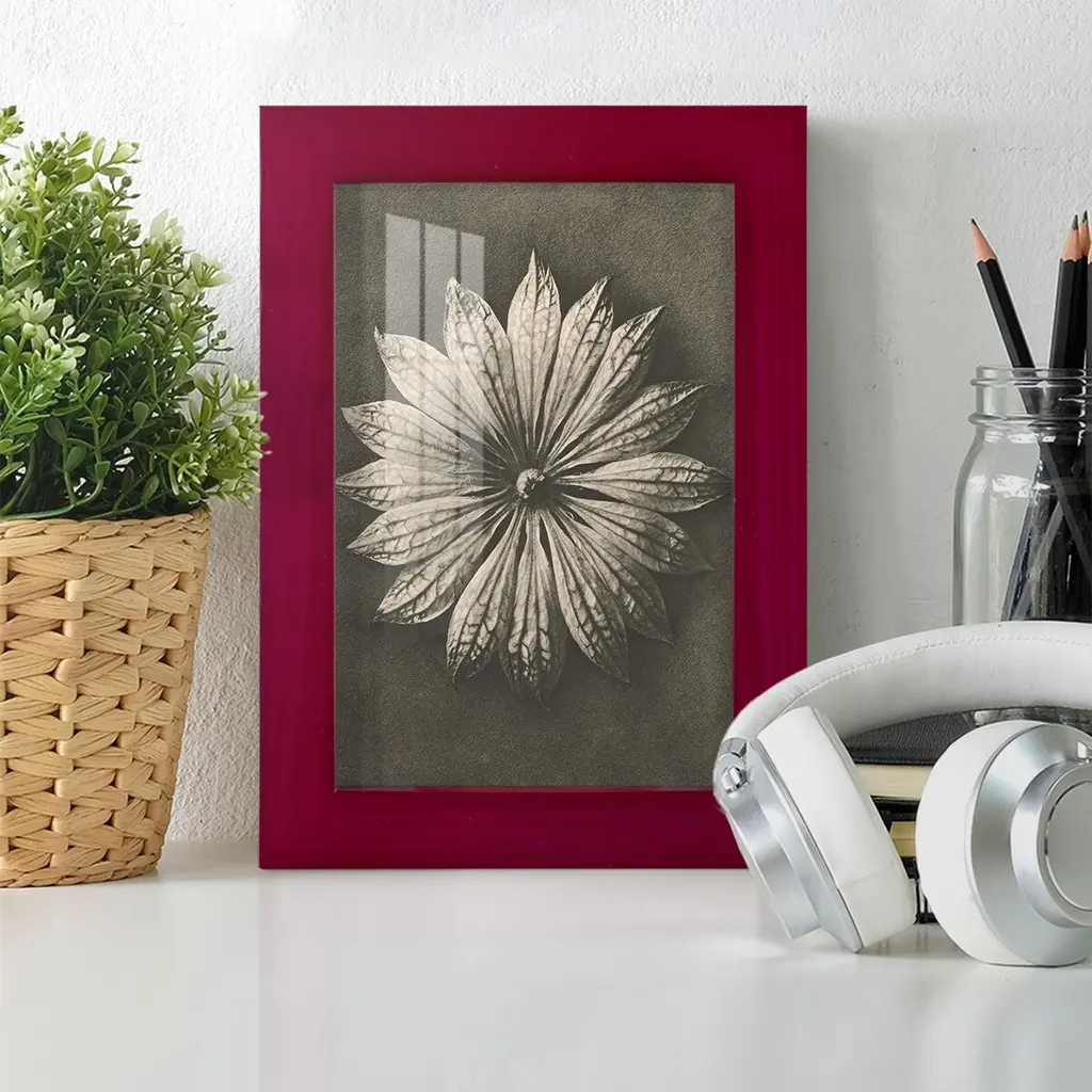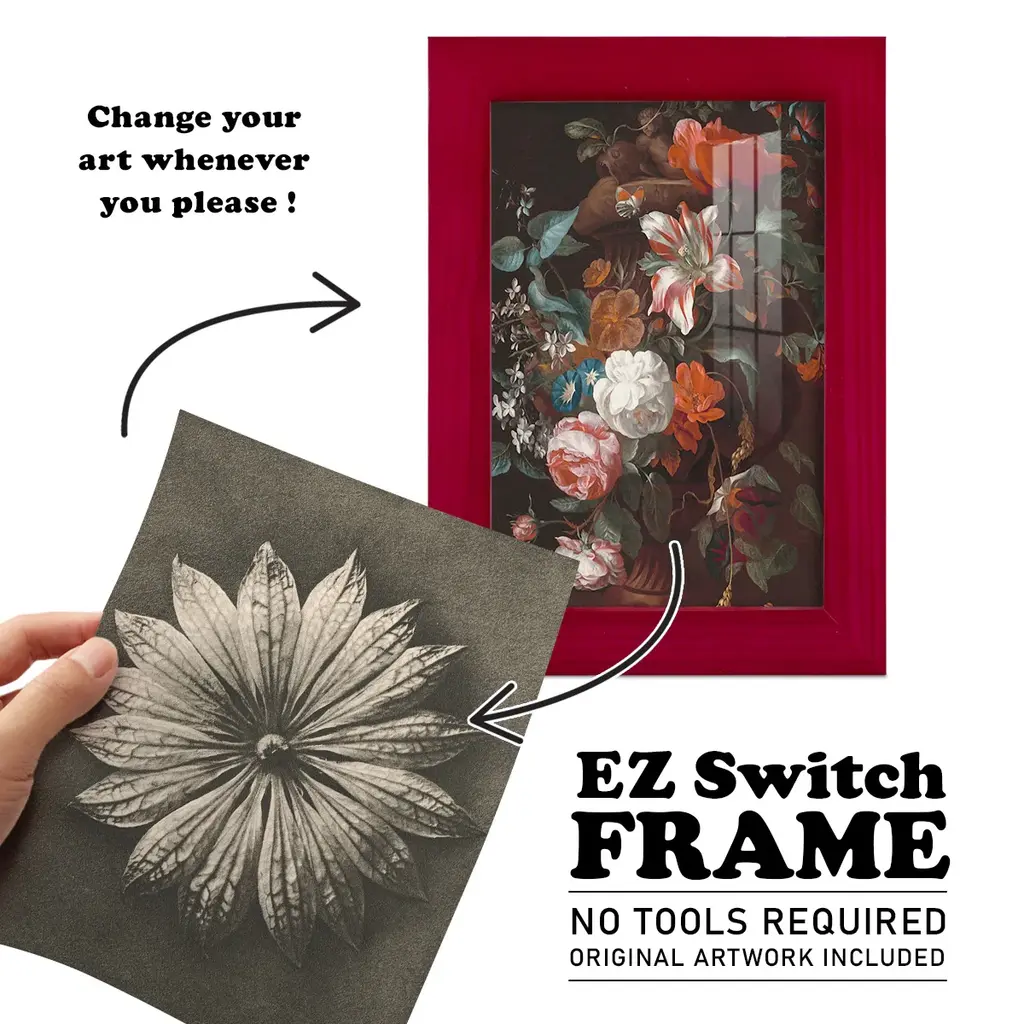 Blossfeldt Flower II -EZ SWITCH Framed Print w/glass-Cherry Red A delightful, framed print. Featuring a solid wood frame with real wood glass. This premium print is giclee quality. In addition, every frame features a removable back and table top stand. This allows you to change your art in the future or to just stand the art on a table for a new look. We are sure you'll enjoy our new series of EZ SWITCH Framed Art. Solid Wood Frame Real Glass Removable / Replaceable Art Built in Tabletop Stand Sizes range from 4x6 up to 12x15 - buy just one or pair them up as sets as you see fit.