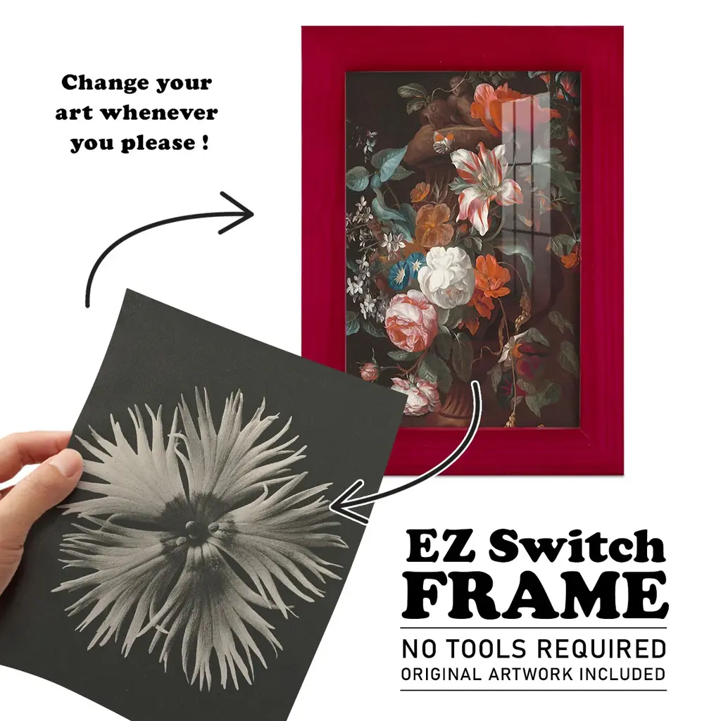 Blossfeldt Flower IV -EZ SWITCH Framed Print w/glass-Cherry Red A delightful, framed print. Featuring a solid wood frame with real wood glass. This premium print is giclee quality. In addition, every frame features a removable back and table top stand. This allows you to change your art in the future or to just stand the art on a table for a new look. We are sure you'll enjoy our new series of EZ SWITCH Framed Art. Solid Wood Frame Real Glass Removable / Replaceable Art Built in Tabletop Stand Sizes range from 4x6 up to 12x15 - buy just one or pair them up as sets as you see fit.
