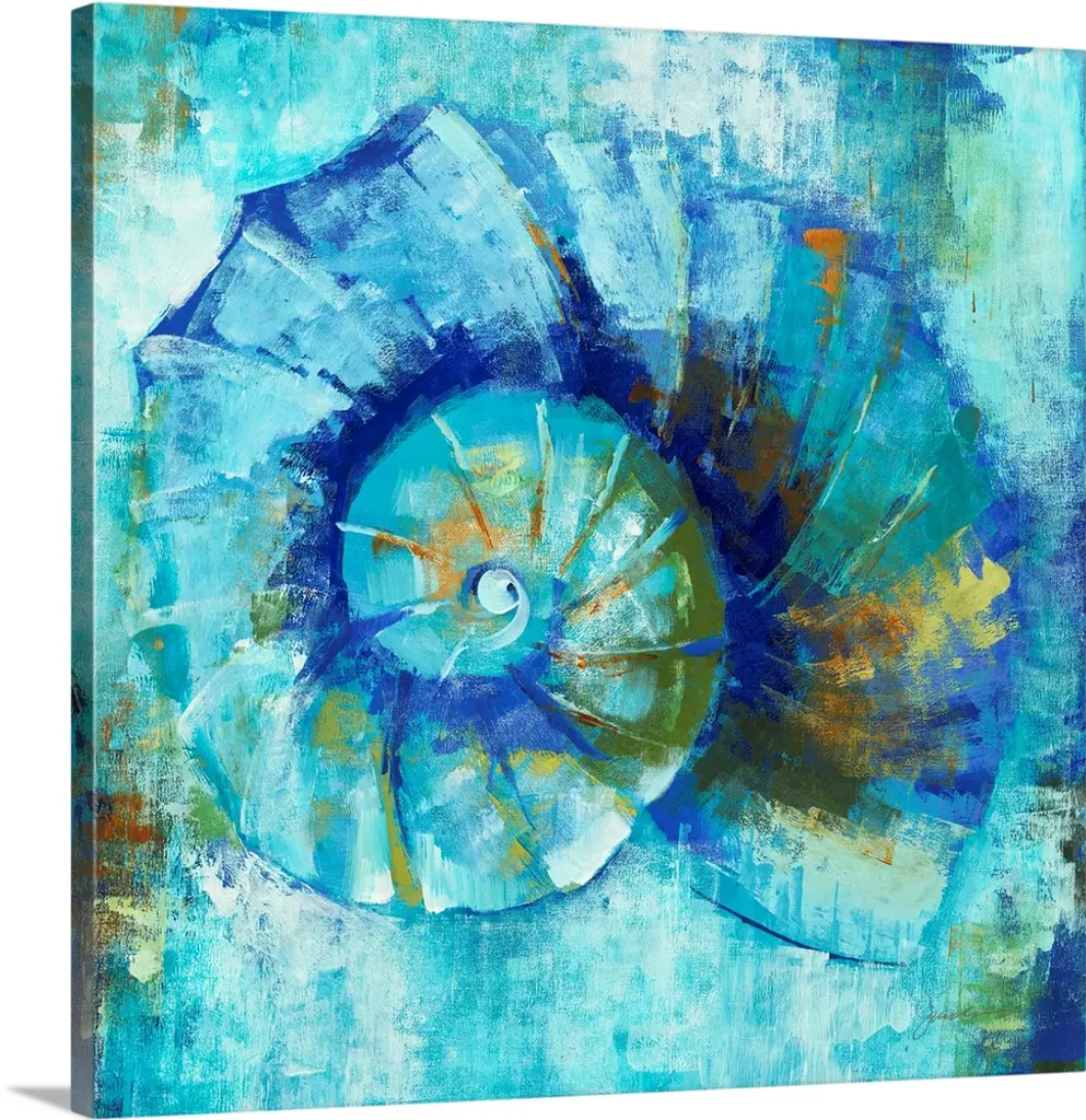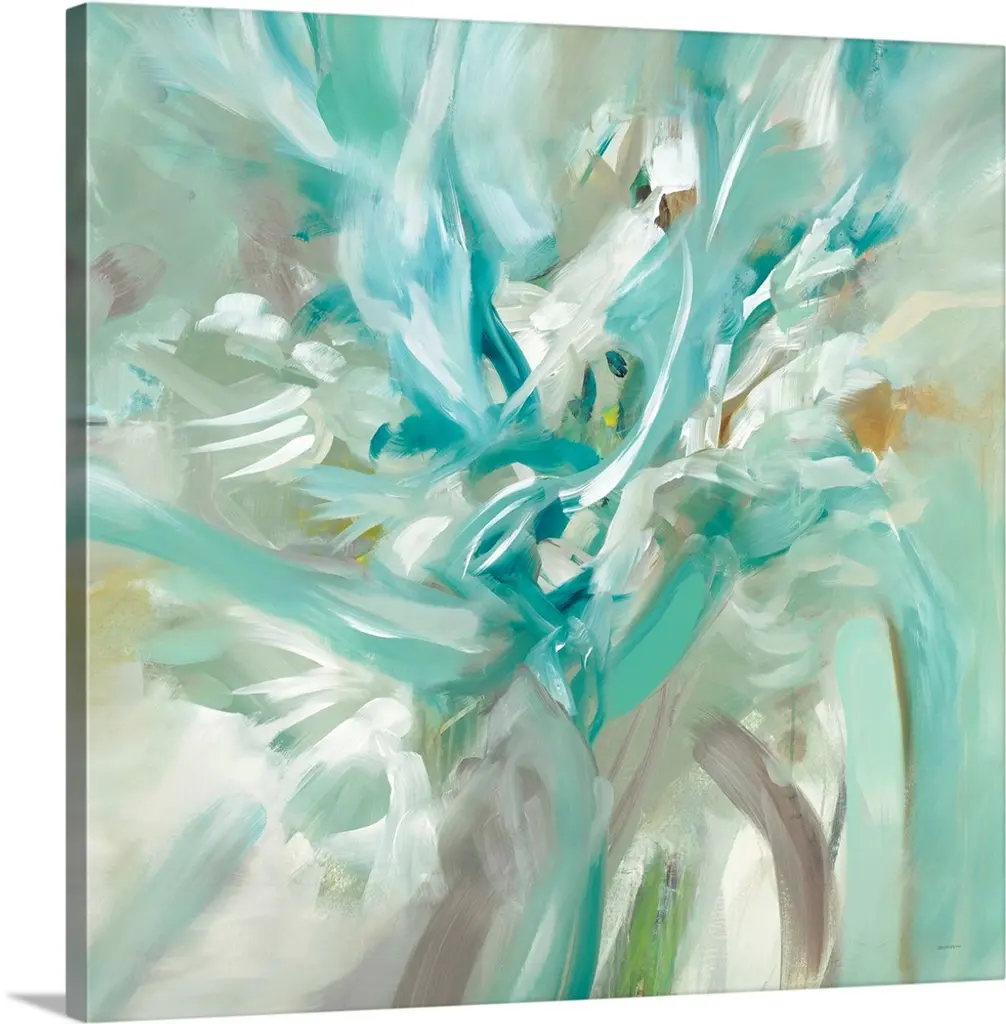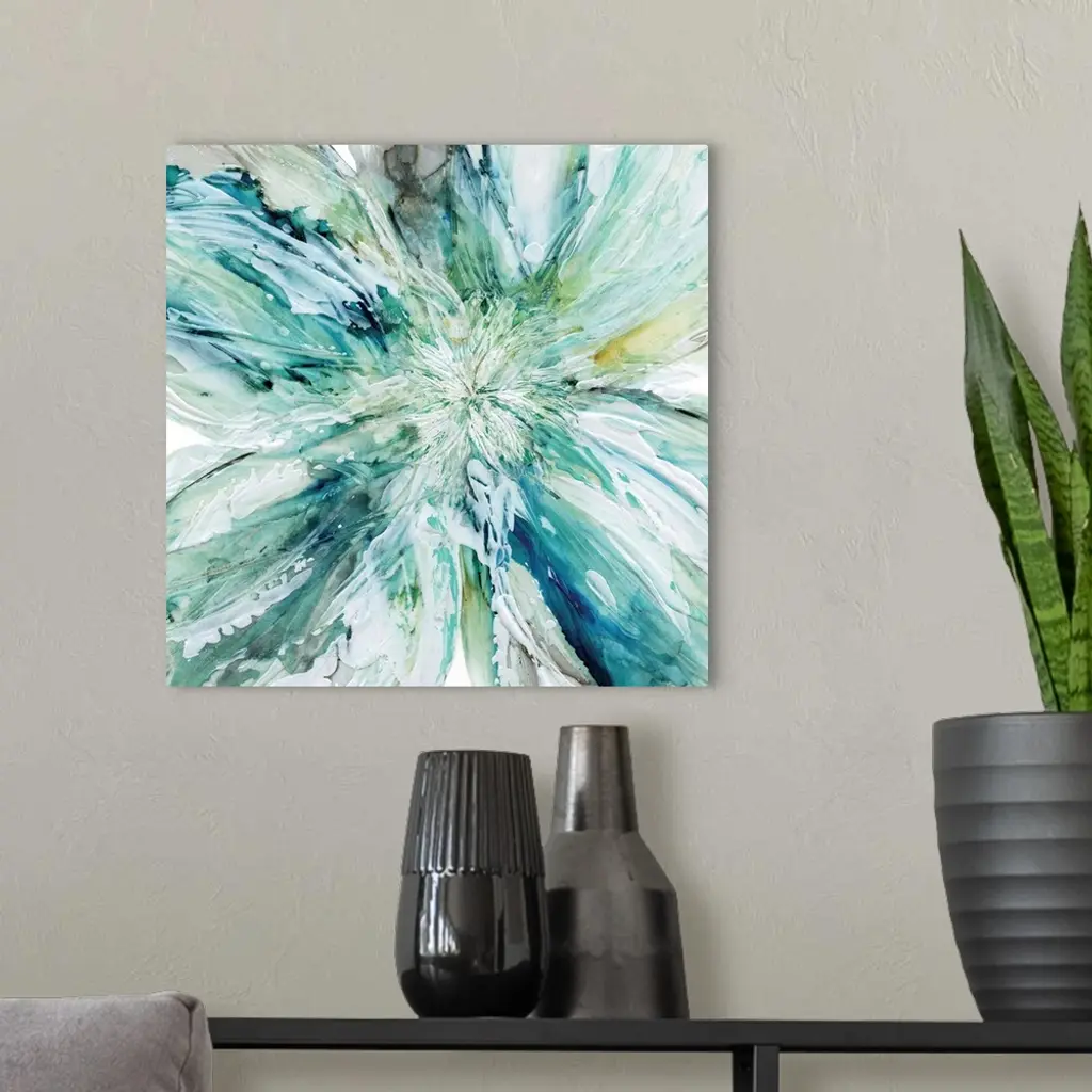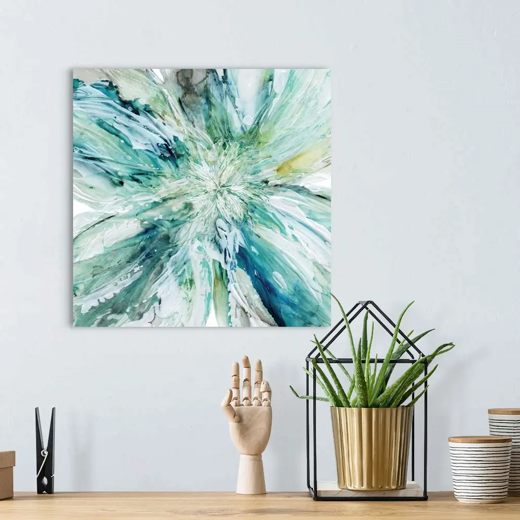 Square abstract painting of a large flower with thick layered paint in shades of blue, yellow, green, and white.