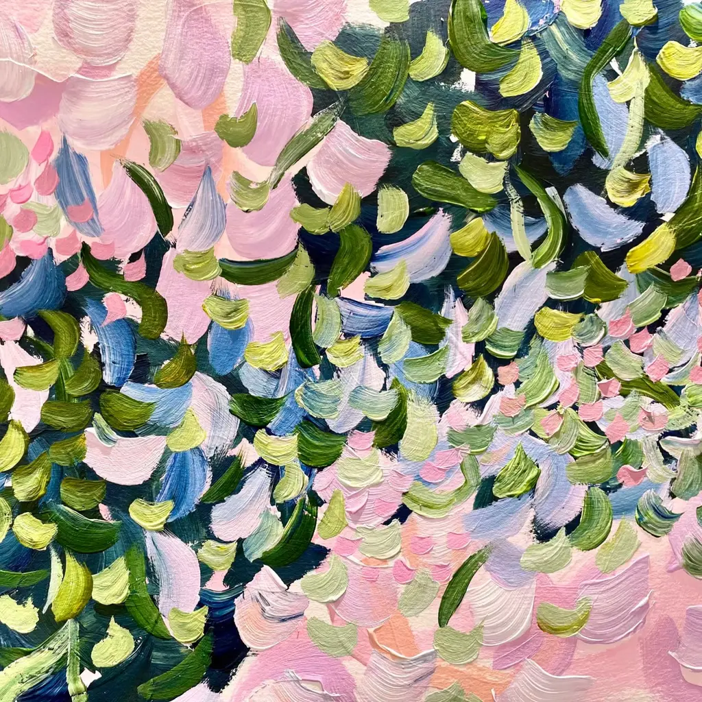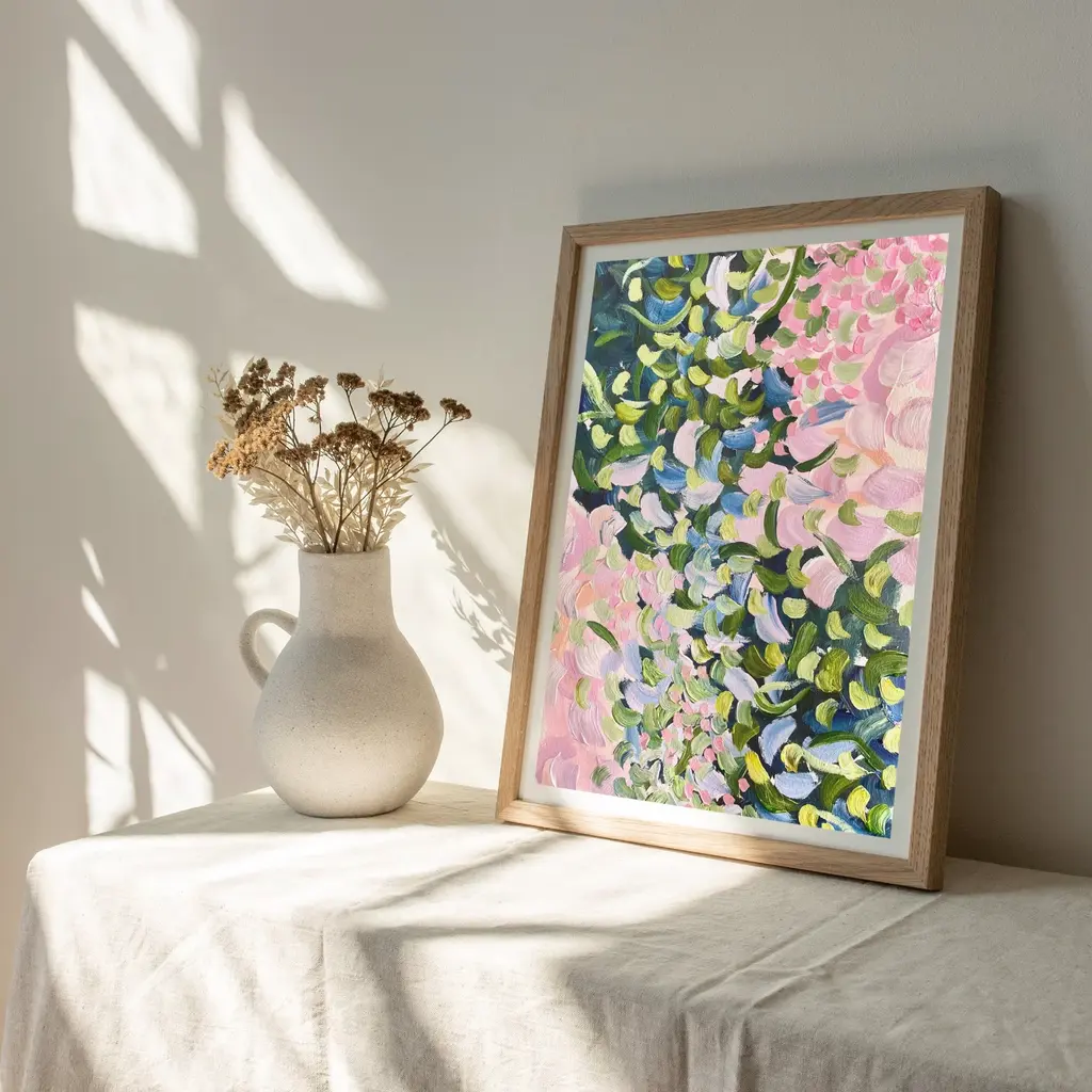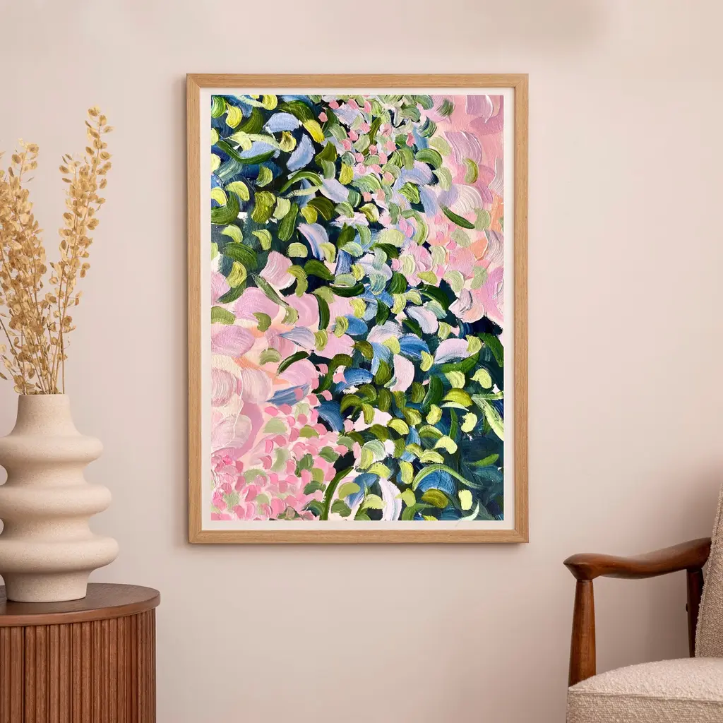 Inspired by the first blossom of spring, this abstract floral print combines the cool tones of winter and the warm, rich pinks and vibrant greens of spring. Originally created using thick impasto marks, this fine art print captures the beautiful textures and colours of the original artwork for a beautiful burst of spring in any interior space. Printed on heavyweight 316gsm cotton rag textured paper using archival-quality inks, this A3 giclée print will maintain its beautiful vibrancy for many years to come. Each print has a white border so it can easily fit into a standard size frame. Print is sold unframed.
