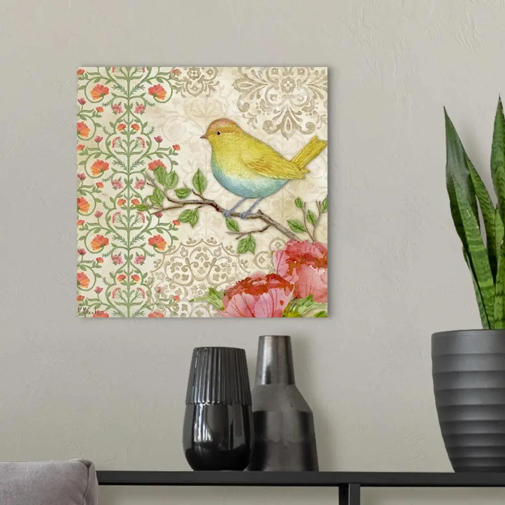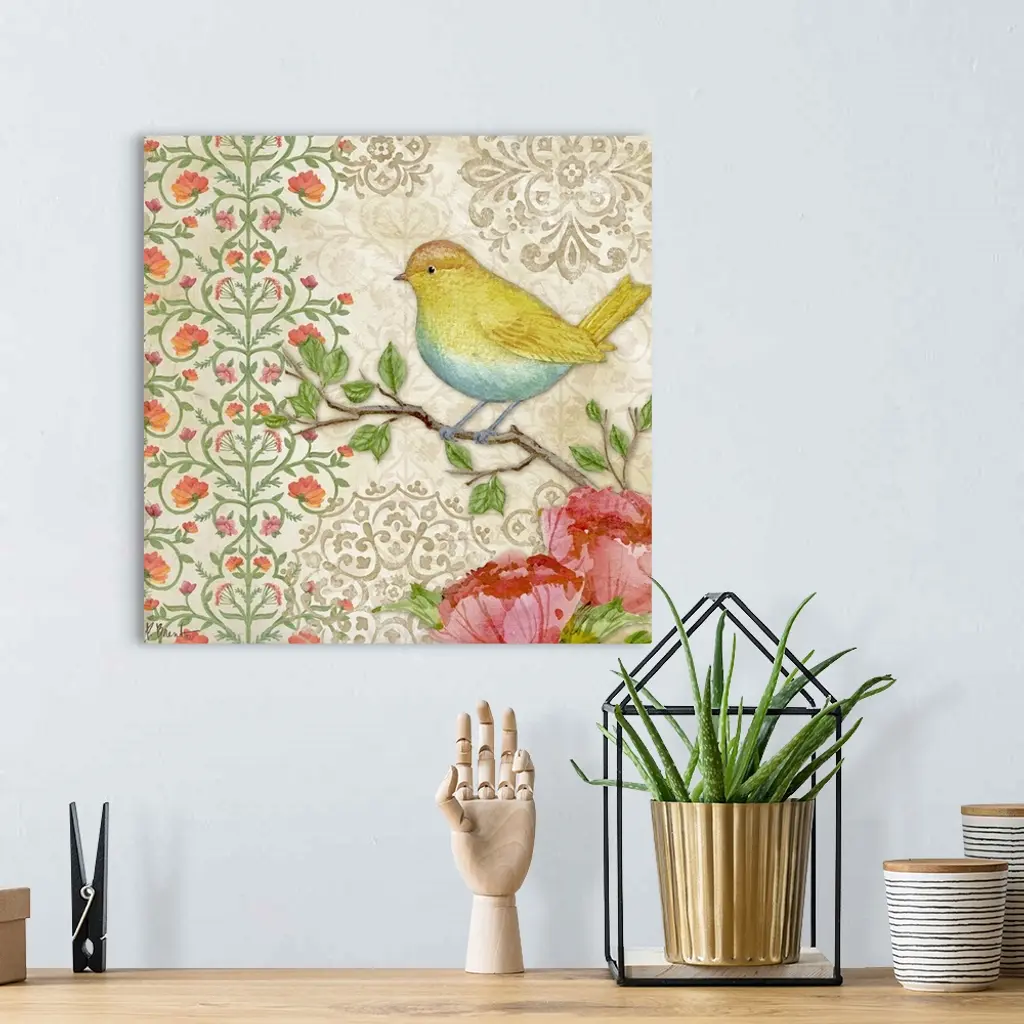 Contemporary decorative artwork with a floral and vine design with a songbird.
