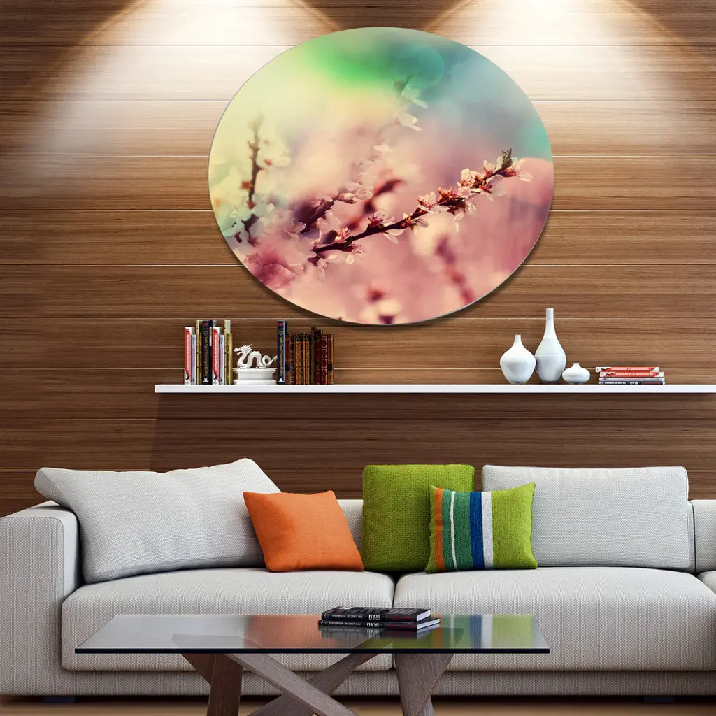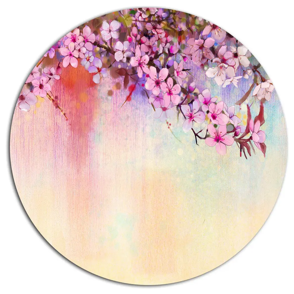 Bring Contemporary Abstraction to your home with this large Circle Metal wall art. This Blossoming Pink Cherry Branches Metal Artwork makes it the focal point of any room or office. - White Gloss Coating ensures colors are extra vibrant with light reflection.- Aluminum grade Sheet Metal with 1 inch mounting frame on the back giving the illusion that the artwork is floating on the wall..- Mounting Brackets are included along with instructions.- High Quality Digital images are created directly into a glossy aluminum panel producing a stunning and captivating print into the glossy finish of the metal.- Water, Fire and Scratch resistant HD Aluminum panels.- Looks better than any photo paper and guaranteed to last at least 20 years- Easy to clean with a microfiber cloth. Colors are far superior to regular Canvas Art. - Easy to Hang