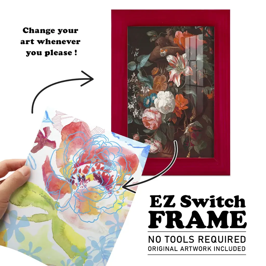 Blossoms in the Sun II -EZ SWITCH Framed Print w/glass-Cherry Red A delightful, framed print. Featuring a solid wood frame with real wood glass. This premium print is giclee quality. In addition, every frame features a removable back and table top stand. This allows you to change your art in the future or to just stand the art on a table for a new look. We are sure you'll enjoy our new series of EZ SWITCH Framed Art. Solid Wood Frame Real Glass Removable / Replaceable Art Built in Tabletop Stand Sizes range from 4x6 up to 12x15 - buy just one or pair them up as sets as you see fit.