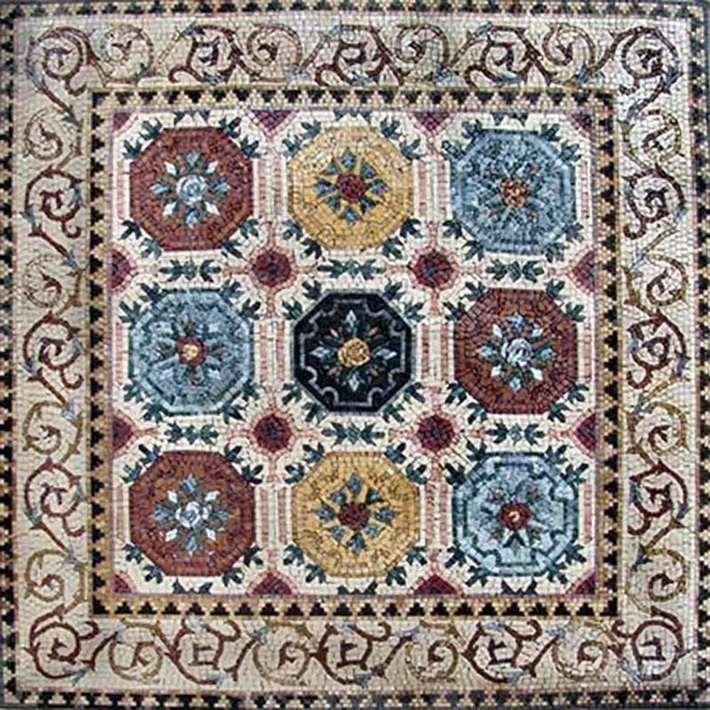 Introducing the Blossoms Mosaic Panel - Cordelia, a stunning centerpiece that marries elegance with artistic design. This exquisite mosaic panel showcases nine intricately crafted octagon gardens, each adorned with a delicate botanical vine border in a harmonious palette of green, gold, and rich red. Set against a backdrop of soft pink and ivory fields, the Blossoms Mosaic Panel - Cordelia transforms any space into a vibrant retreat that celebrates nature's beauty.Imagine the charm it brings to your home, reminiscent of an intricate rug pattern that draws the eye and elevates your decor. Perfect for a marble tile floor, the Blossoms Mosaic Panel - Cordelia commands attention and serves as a conversation starter in any room. Its meticulous craftsmanship and thoughtful design make it an ideal addition to entryways, living rooms, and dining areas.Available in four stock sizes, the Blossoms Mosaic Panel - Cordelia can fit seamlessly into your existing decor while offering flexibility for your specific needs. For those seeking a truly personalized touch, we also offer the option to commission the panel to your unique specifications. This ensures that your mosaic perfectly aligns with your aesthetic vision.Elevate your space with the Blossoms Mosaic Panel - Cordelia and let it inspire a sense of wonder and tranquility in your home. Embrace the extraordinary beauty of this art piece and indulge in the transformative power of decorative mosaics.