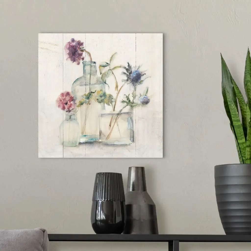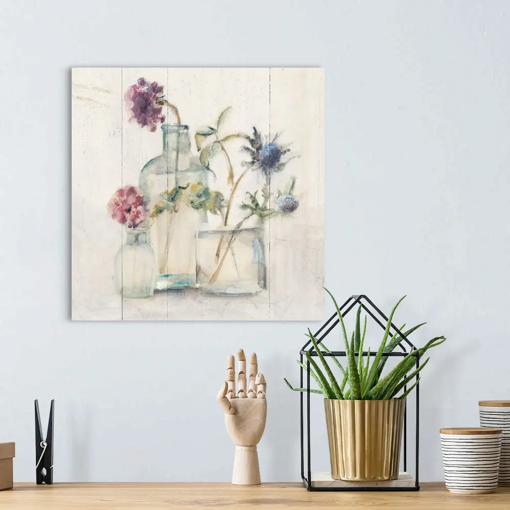 Square artwork with flowers in glass vases on a rustic shiplap background.