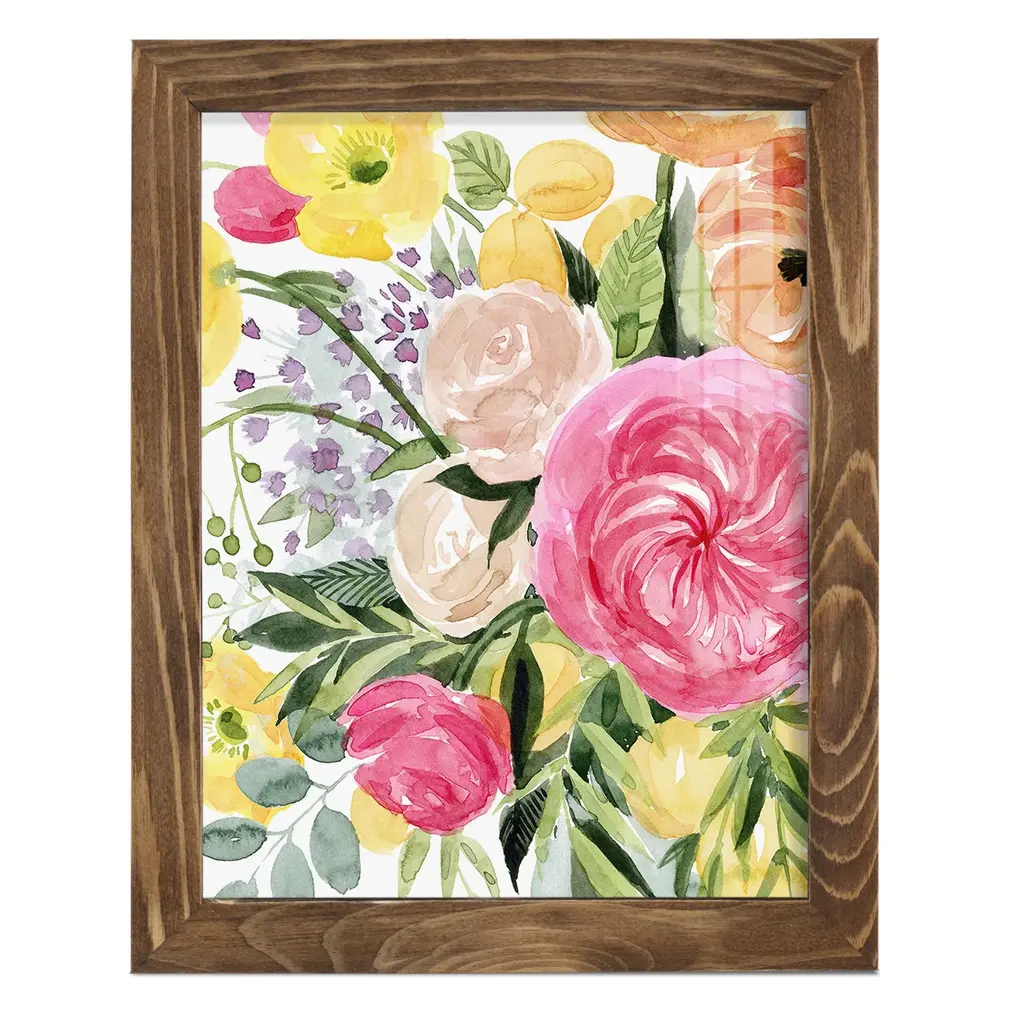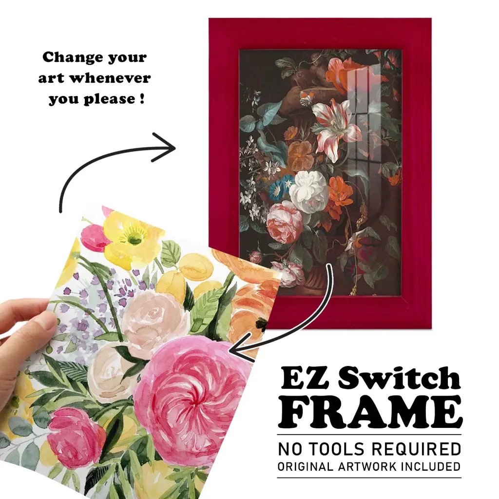 Blossomy Gathering I -EZ SWITCH Framed Print w/glass-Cherry Red A delightful, framed print. Featuring a solid wood frame with real wood glass. This premium print is giclee quality. In addition, every frame features a removable back and table top stand. This allows you to change your art in the future or to just stand the art on a table for a new look. We are sure you'll enjoy our new series of EZ SWITCH Framed Art. Solid Wood Frame Real Glass Removable / Replaceable Art Built in Tabletop Stand Sizes range from 4x6 up to 12x15 - buy just one or pair them up as sets as you see fit.