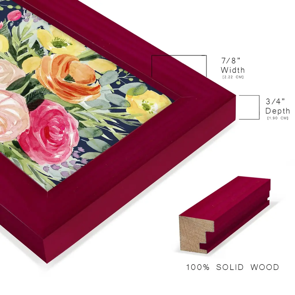 Blossomy Gathering IV -EZ SWITCH Framed Print w/glass-Cherry Red A delightful, framed print. Featuring a solid wood frame with real wood glass. This premium print is giclee quality. In addition, every frame features a removable back and table top stand. This allows you to change your art in the future or to just stand the art on a table for a new look. We are sure you'll enjoy our new series of EZ SWITCH Framed Art. Solid Wood Frame Real Glass Removable / Replaceable Art Built in Tabletop Stand Sizes range from 4x6 up to 12x15 - buy just one or pair them up as sets as you see fit.