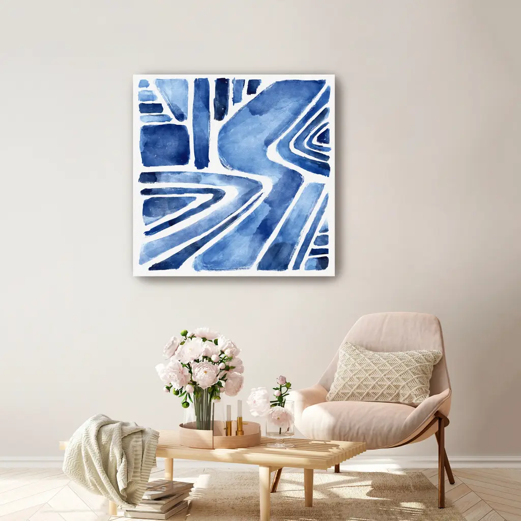 Transform your living space with this mesmerizing blue abstract canvas art "Blue Abstract Geometric" by Gia Hoang. Featuring a captivating blend of blue hues, this artwork brings a sense of tranquility and depth to any room. The abstract design evokes a serene atmosphere, making it a perfect addition to both contemporary and classic interiors. Available in black frame, dark walnut frame, oak frame, or as a wrapped canvas. Our Gallery Wrap Canvas Prints are proudly assembled with high quality materials in California, USA. Each piece is printed on a thick, archival grade canvas using Giclee technology. It is then hand-stretched by our experienced artisans over solid wood bars, which will not warp over time. The final product is a piece personally crafted for you to confidently display on your wall. Care and Assembly: Ensure that the location of your piece has little to no exposure to heat, sunlight, and moisture. Wipe clean, only if needed. Each piece includes a sawtooth hanger to hang on your wall horizontally.